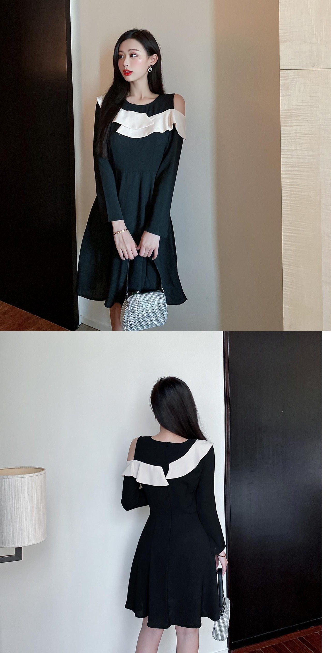 成熟した姉スタイルの女性の秋のハイレベルなセレブ感のある気質デザイン黒と白のステッチのセンスセクシーなオフショルダードレス micat86470938735