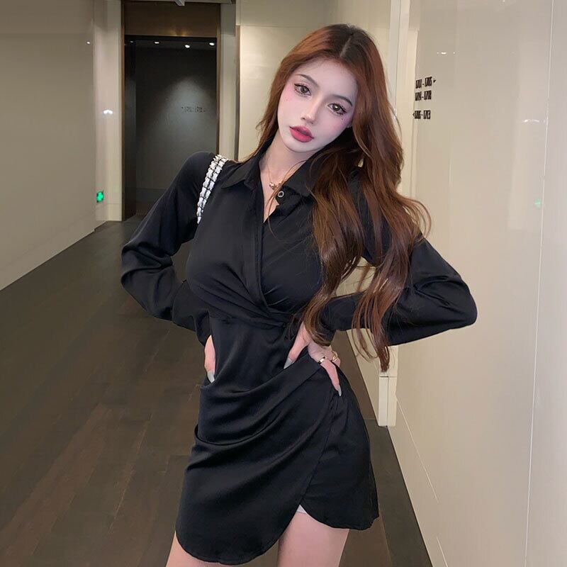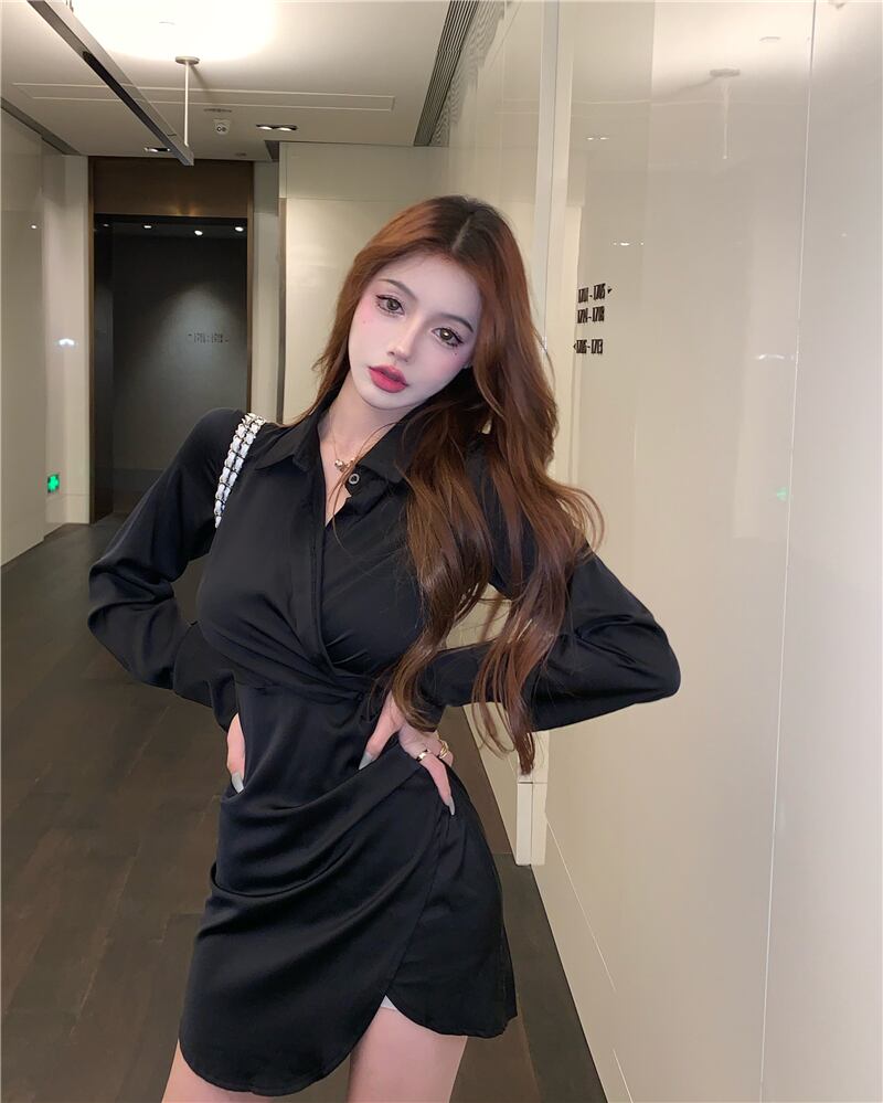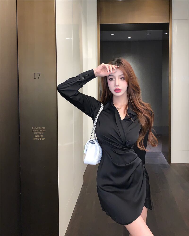 黒のシャツスカート秋の婦人服2021年新作洋風デザインセンスフォールドウエストスリミングワンピース micat63794186203