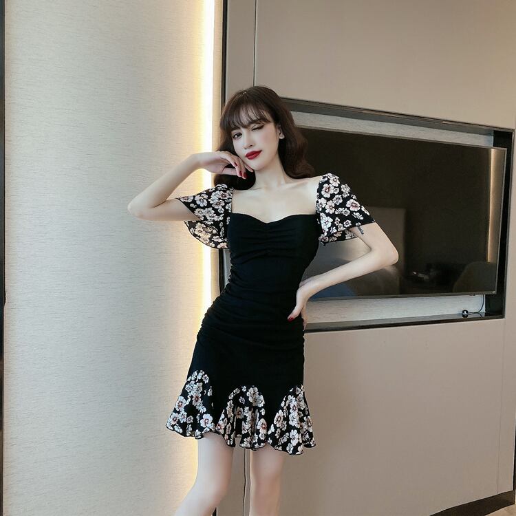 2021年夏新しい女性らしさセクシーなレトロなフレンチスクエアカラーフローラルステッチフリルフィッシュテールドレス micat52056972161