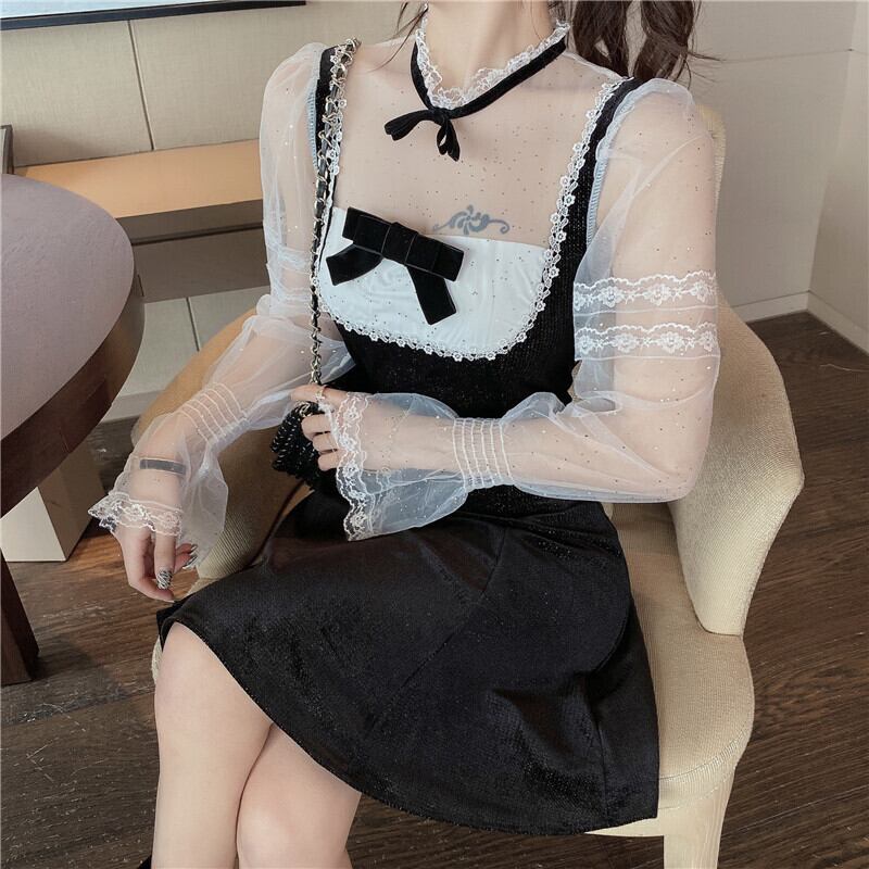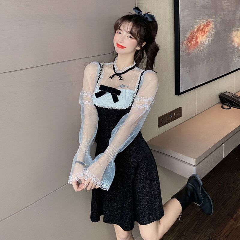 フランスのミニドレス秋冬モデルヘップバーンスタイルのスーパーフェアリーメッシュステッチゴールドベルベットフェイク2ロングドレス micat86011357817
