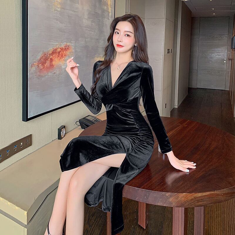 イブニングドレス秋冬ナイトクラブレディースナイトバンケット気質セクシーVネック長袖ベルベットミドル丈ドレス micat40458972338