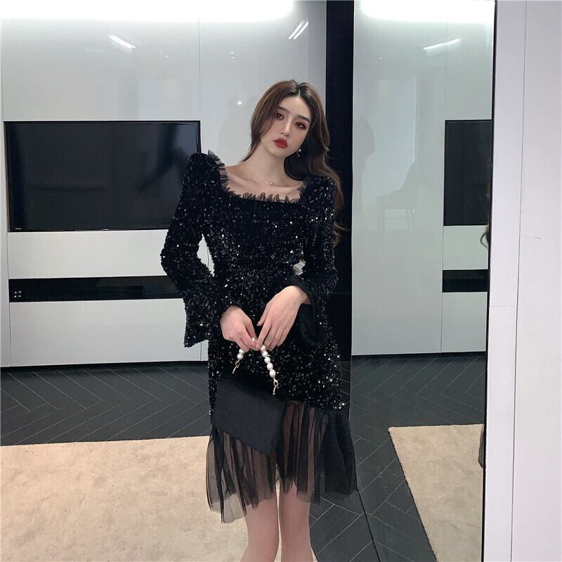 イブニングドレス、ナイトクラブ、レディースドレス、ナイトバンケット、きらめくスパンコールメッシュステッチ、長袖、ミドル丈ドレス micat51813197985