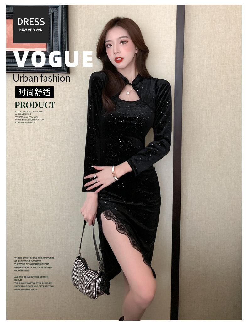 2021年秋新しい女性の若いモデル光沢のあるブラックゴールドベルベットミドル丈の改良されたチャイナドレス micat49632199195