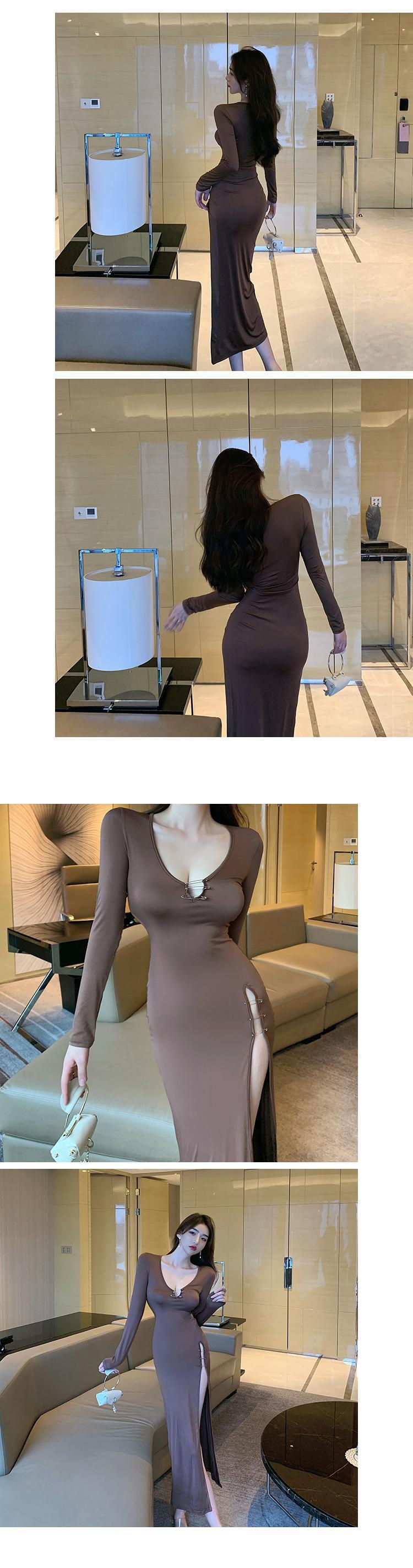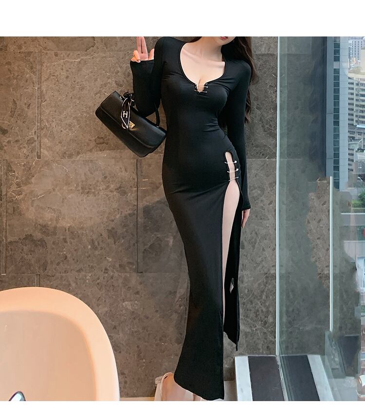 ナイトクラブレディースナイトクラブブラックイブニングドレスロングスカートセクシーローカットディープVネック長袖超ハイスプリットドレス micat99384805484