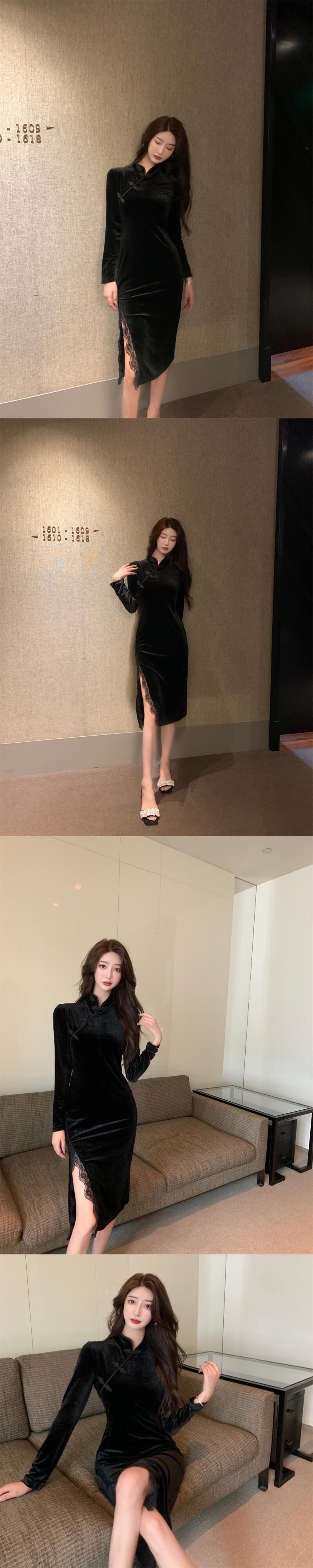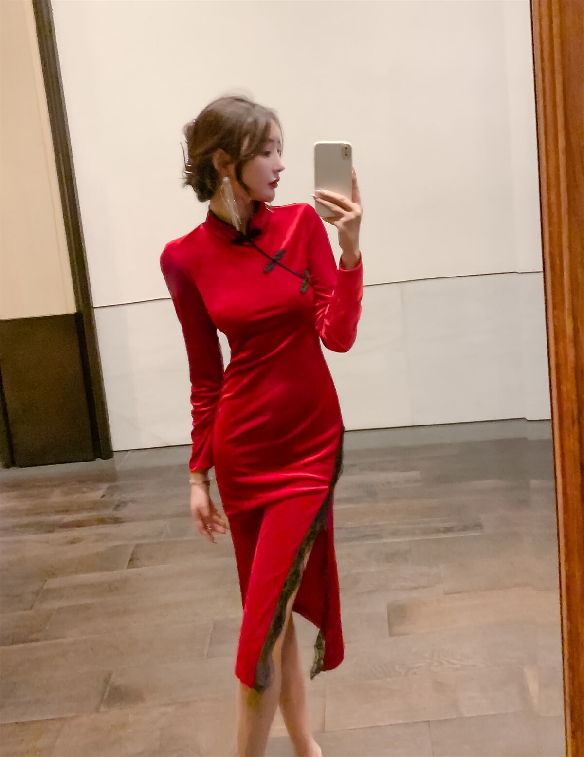 イブニングドレス女性秋冬レトロチャイニーズスタイルトーストドレスゴールドベルベットレッドミドル丈改良チョンサムドレス micat21912305094