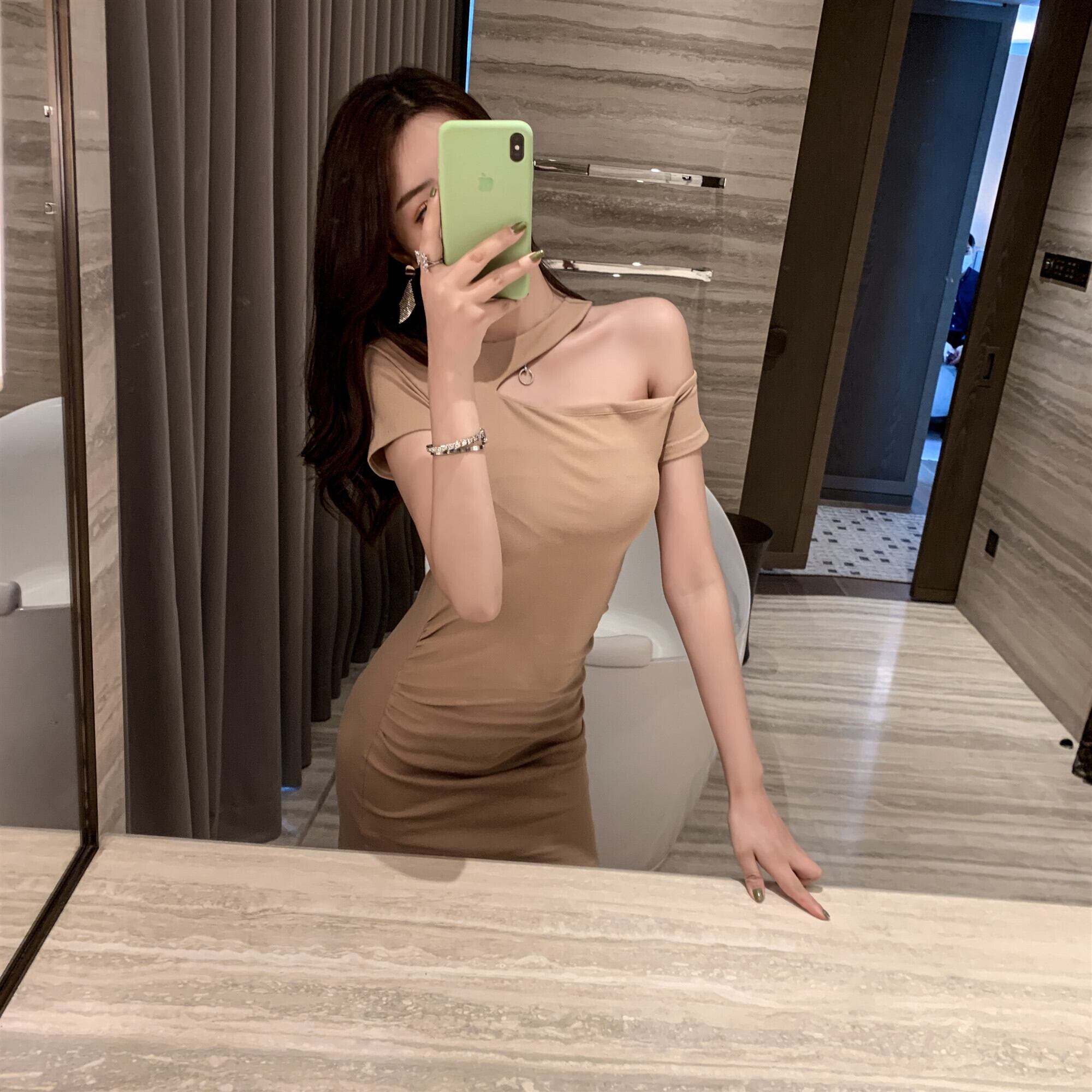 セクシーなストラップレスドレス女性の夏の気質斜め襟ワンショルダー漏れやすい肩半袖黒タイトフィットヒップハンギングネックショートスカート micat80220980668