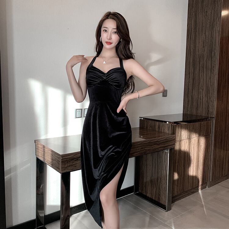 黒のイブニングドレスロングスカートナイトクラブ女性の夜の宴会気質ゴールドベルベットセクシーな背中の開いたホルターネックドレス micat79118978335