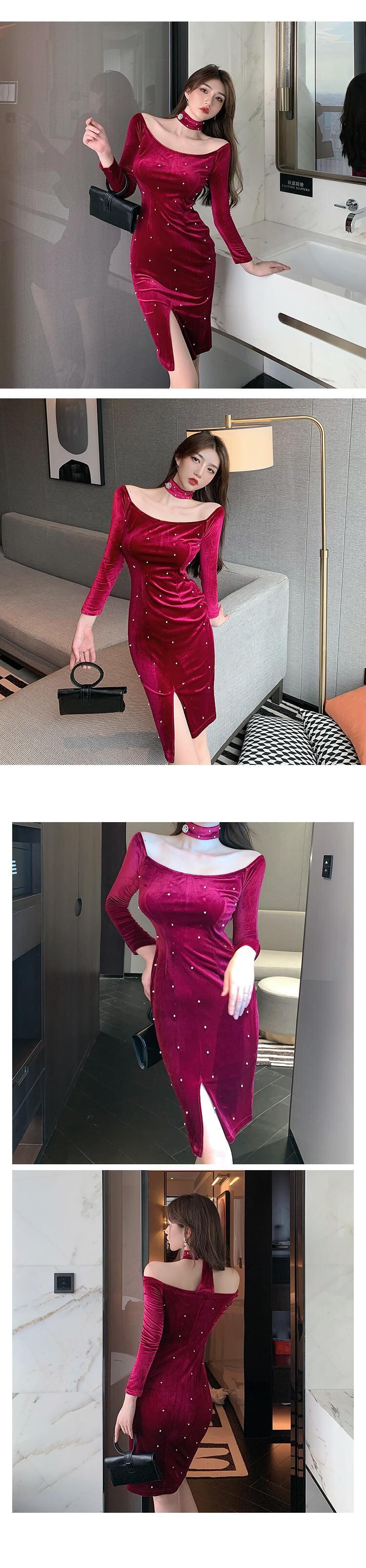 イブニングドレス女性の秋と冬のナイトクラブナイトクラブナイトセクシーなワンショルダーゴールドベルベットミドル丈ホルタードレス micat94208514147
