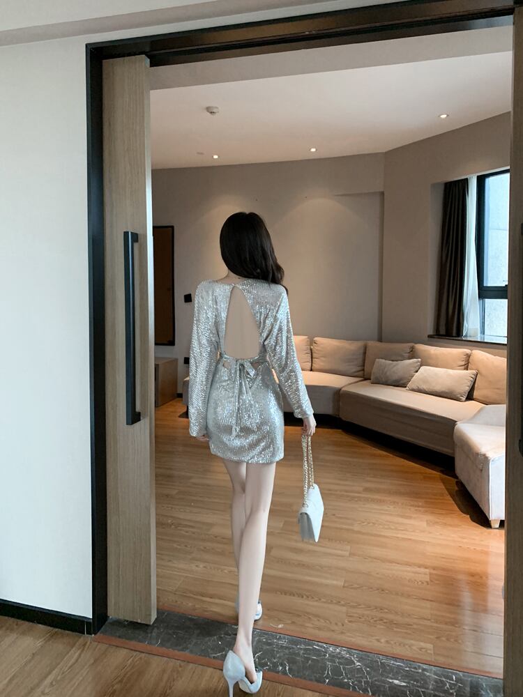 ナイトクラブレディースナイトクラブナイトクラブバーバウンスディキラキラスパンコールセクシーな中空背中の開いた長袖バッグバットドレス micat13229170666