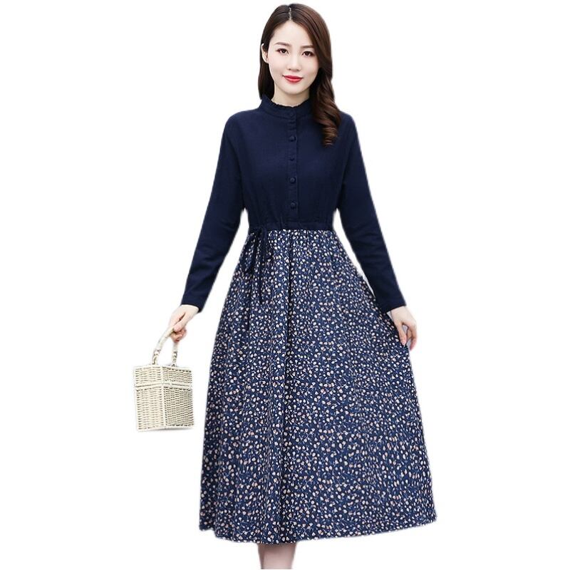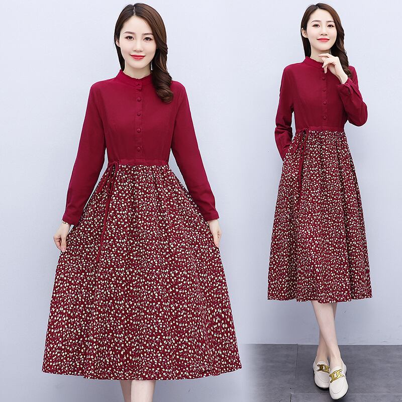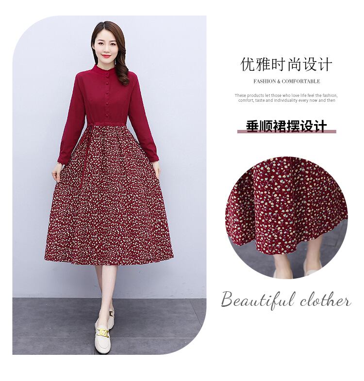 プラスサイズの女性の2021年秋新しいファットmmスタンドアップカラー長袖フローラルアートコットンとリネンドレス女性のマザースカート qmn85045460153