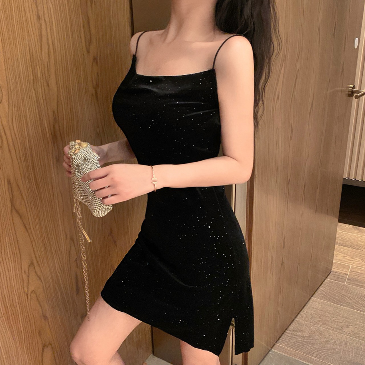ナイトクラブバージャンプディシャイニーリトルブラックスカート気質セクシーなVネックの陰謀バックレスゴールドベルベットサスペンダードレス micat2287930671