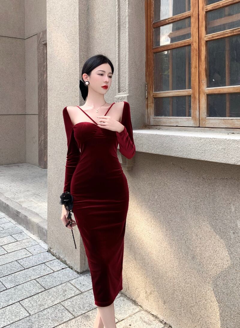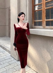 年次総会イブニングドレスナイトショップ女性の秋と冬の宴会気質セクシーなベルベット長袖ミドル丈チューブトップドレス micat18301454833