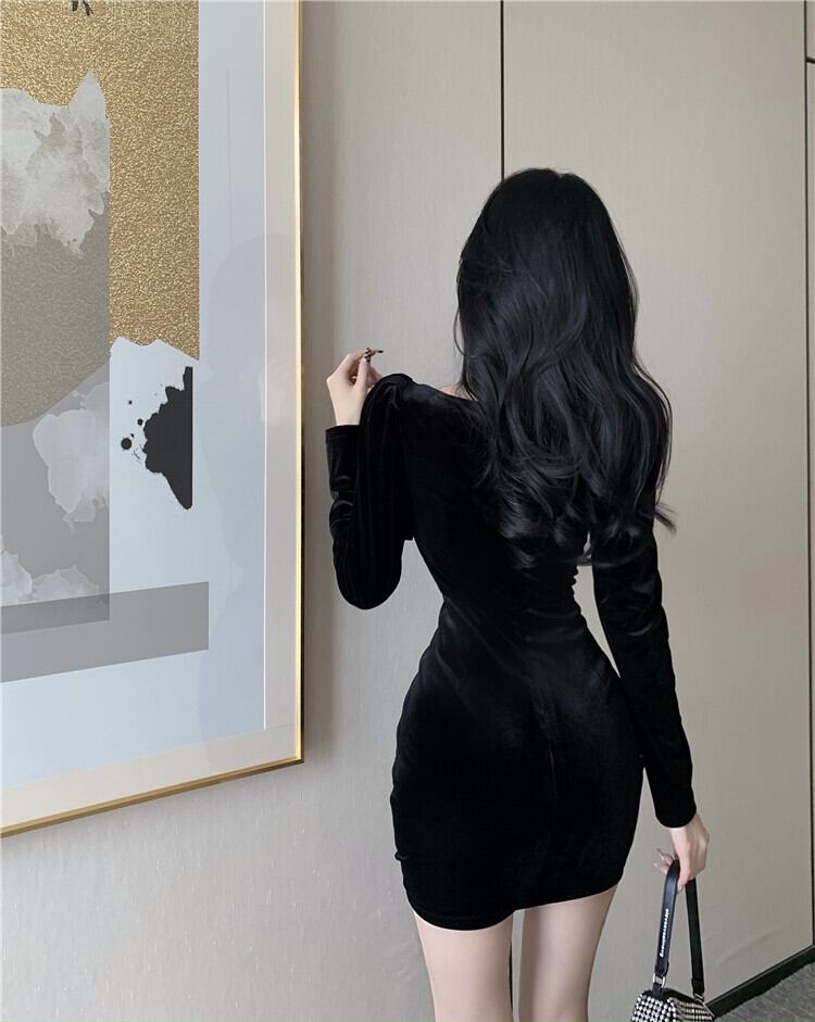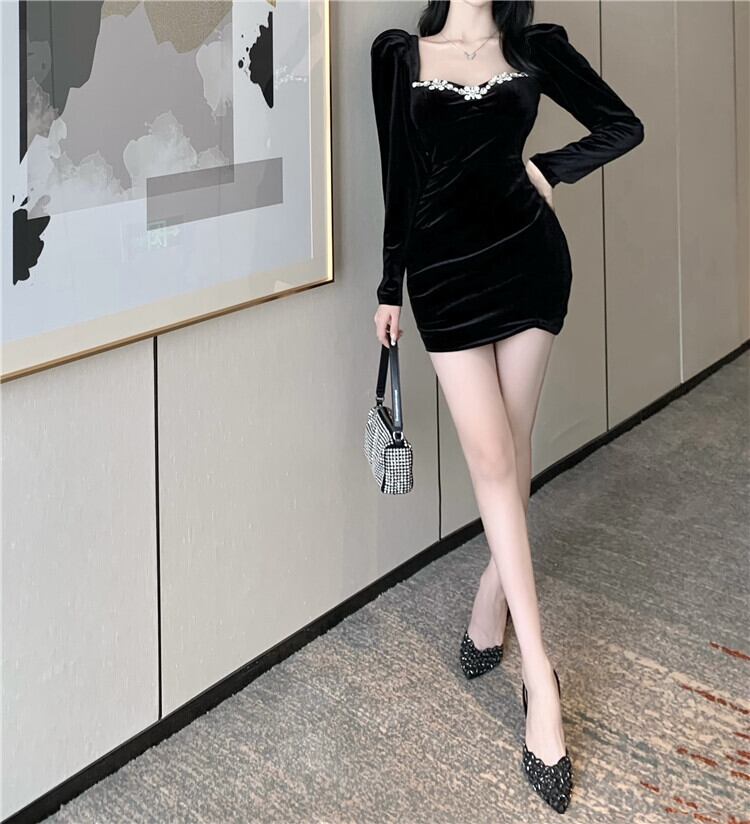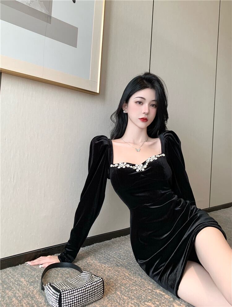 フレンチレトロヘップバーンスタイルリトルブラックドレス女性秋冬ハイエンドセンスネイルダイヤモンドスクエアカラーパフスリーブゴールドベルベットドレス micat94965571696