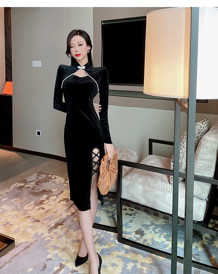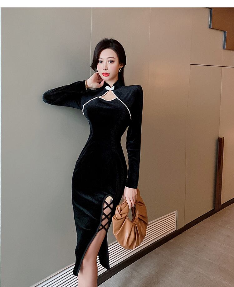 2021年秋新しい女性の生放送アンカー若いゴールドベルベットセクシーなミドル丈の改良されたチャイナドレス micat27612494747