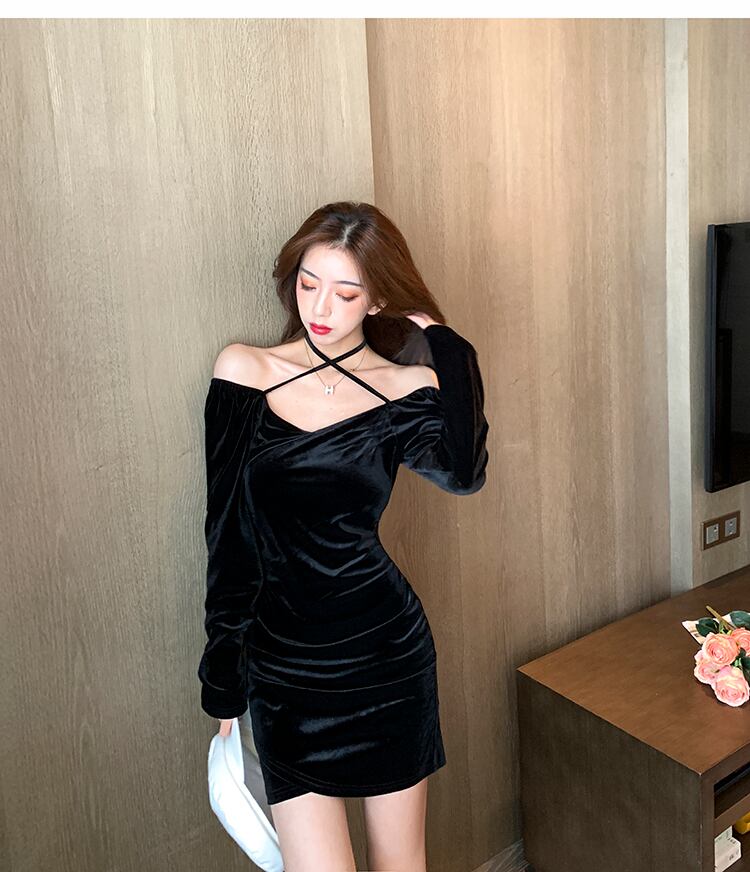 ナイトクラブの女性の秋と冬の新しい夜の夜リトルブラックドレスセクシーなワンショルダーゴールドベルベット長袖オフショルダーネッカードレス micat92632436567