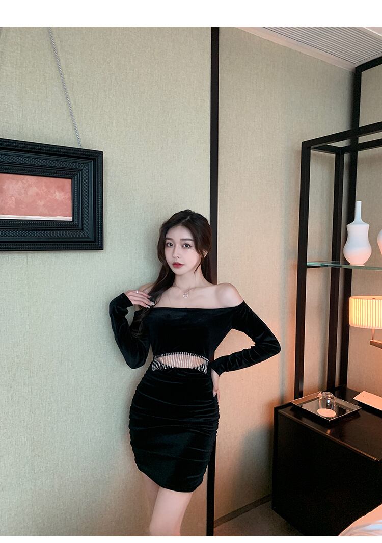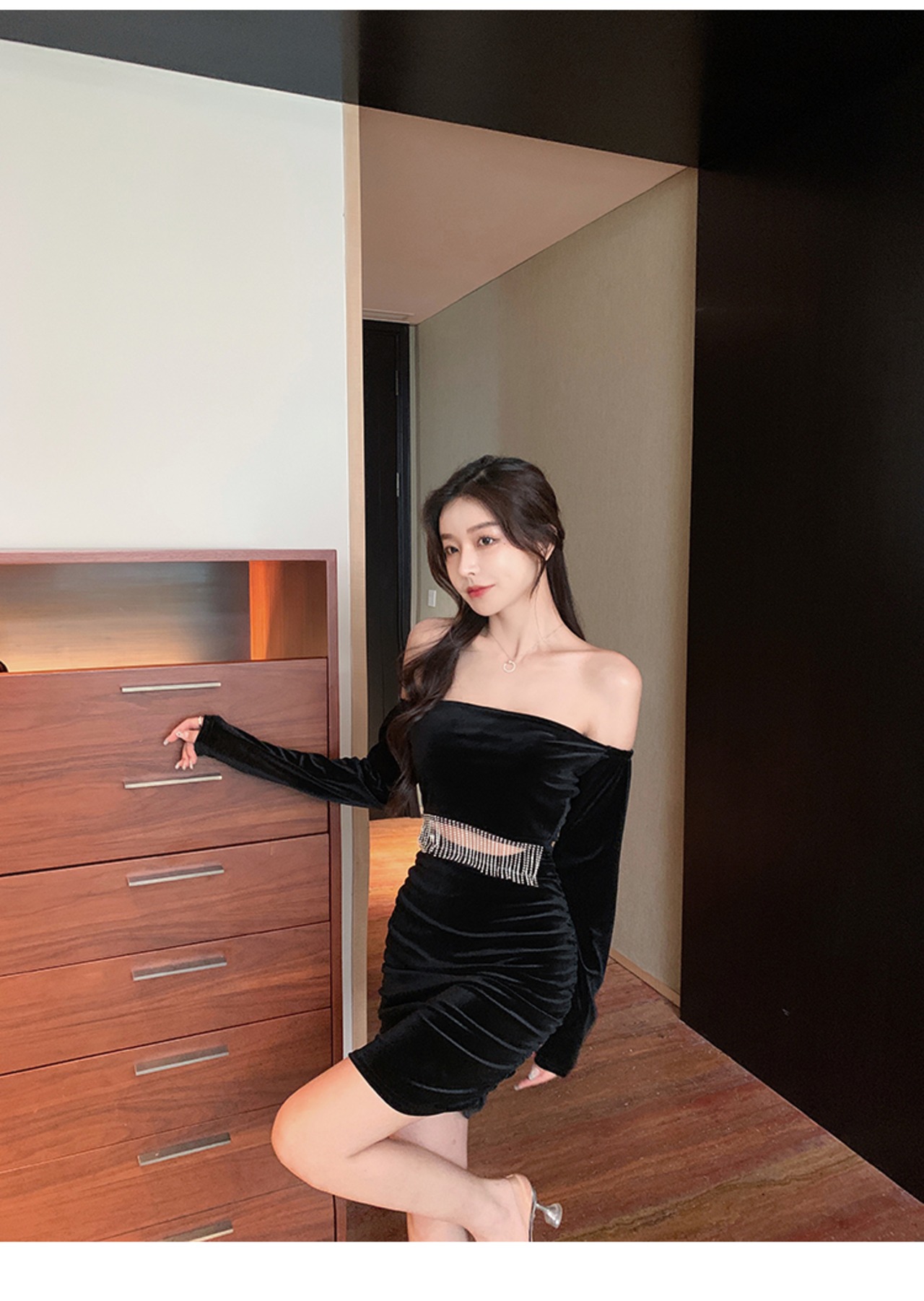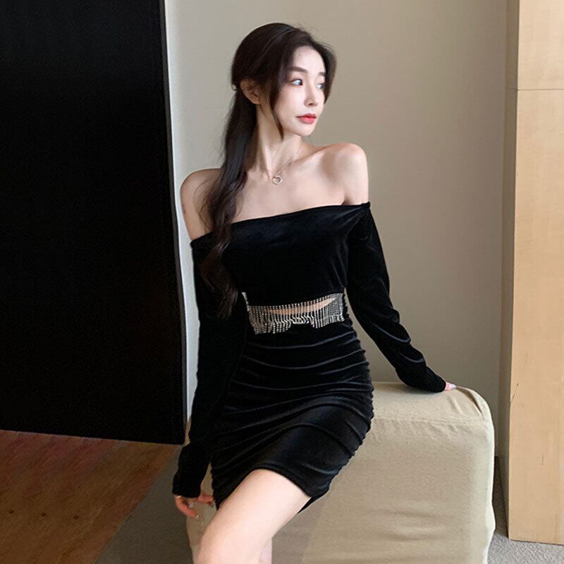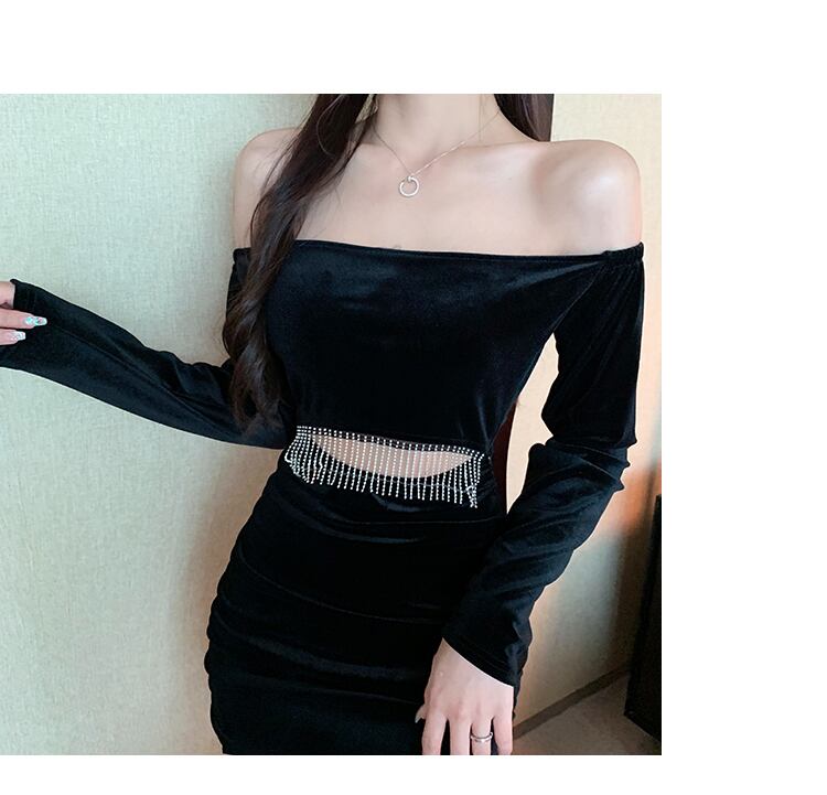 ナイトクラブの女性の秋と冬のナイトバージャンプディセクシーな中空ワンショルダーゴールドベルベット長袖ヒップドレス micat23190922471