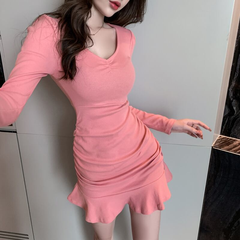 2021年秋新しい女性の純粋な欲望スタイルセクシーなVネック無地スリム痩身フィッシュテールドレス micat27024143785