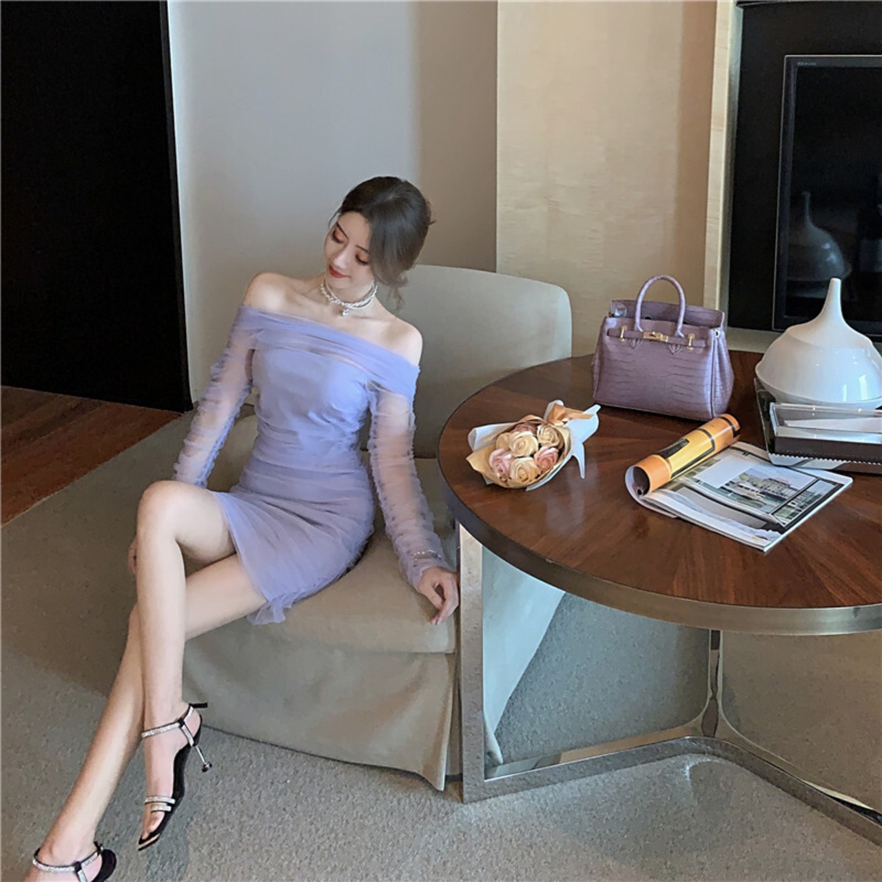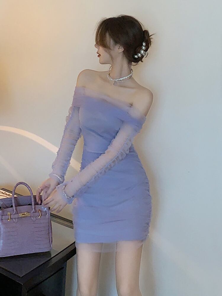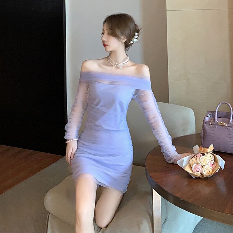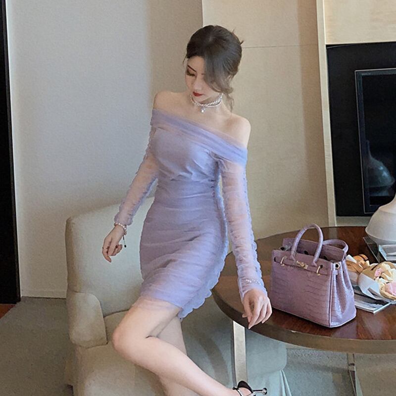 ネット赤いアンカー服女性気質スーパーフェアリーネット糸セクシーなワンショルダー長袖スリム痩身お尻ドレス micat89986347821