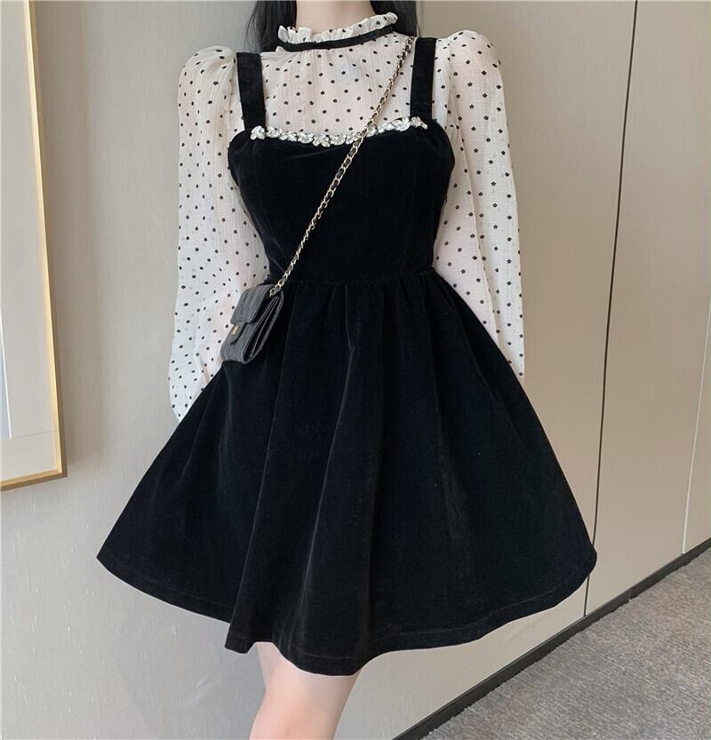 フレンチレトロスモールフレグランススーツ女性秋冬水玉トップ+ゴールドベルベットふくらんでいるベビーバッグスカートツーピーススーツ micat30447547557