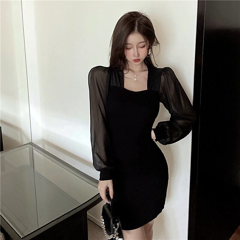 2021年秋新しい女性のヘップバーンスタイルのリトルブラックドレスフランスのセクシーなスクエアネックパフスリーブタイトフィットヒップドレス micat79598583077