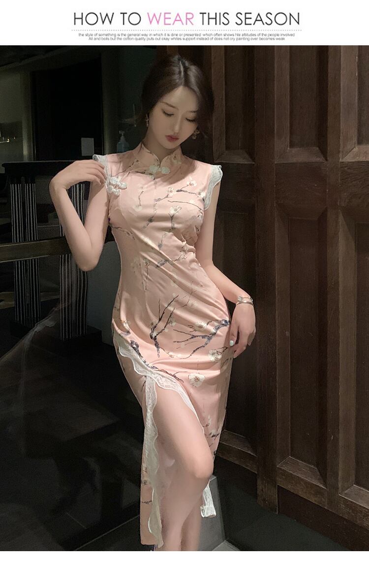 ネットレッドアンカー服女性レトロチャイナスタイルプリントセクシーレースミドル丈改良チャイナドレス micat97000767590