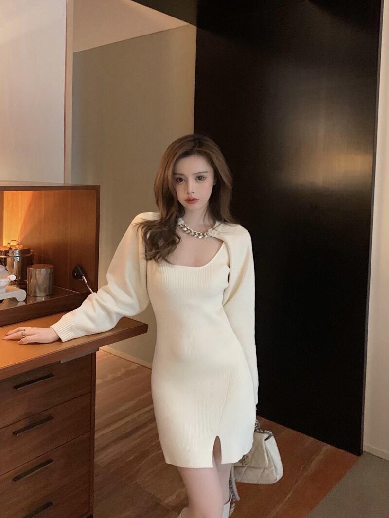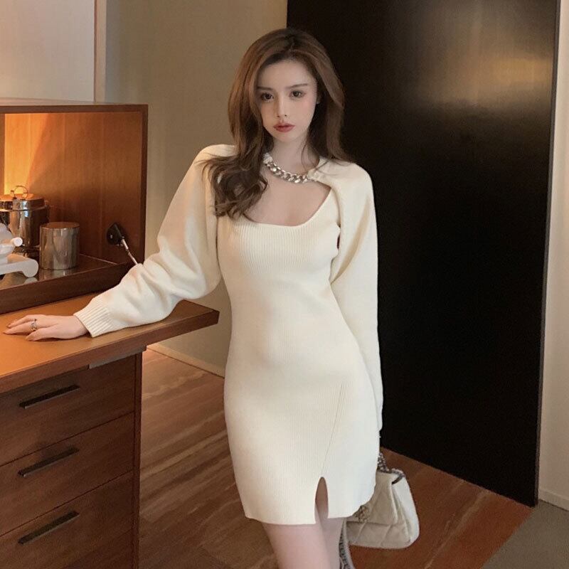 ホットスーツ2021新しい女性の秋と冬のアンカーセクシーなニット長袖ショール+サスペンダースカートツーピースセット micat542447944