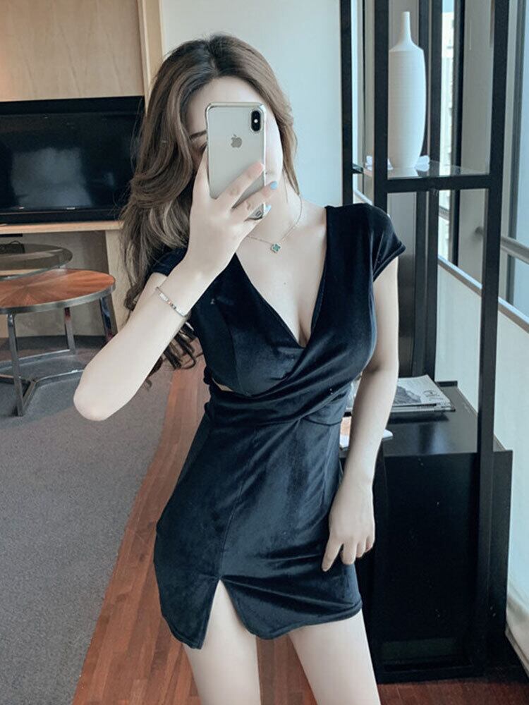 ナイトクラブの女性の夜の作業服セクシーなローカットディープVネックゴールドベルベット半袖スリムフィットヒップドレス micat24852572050