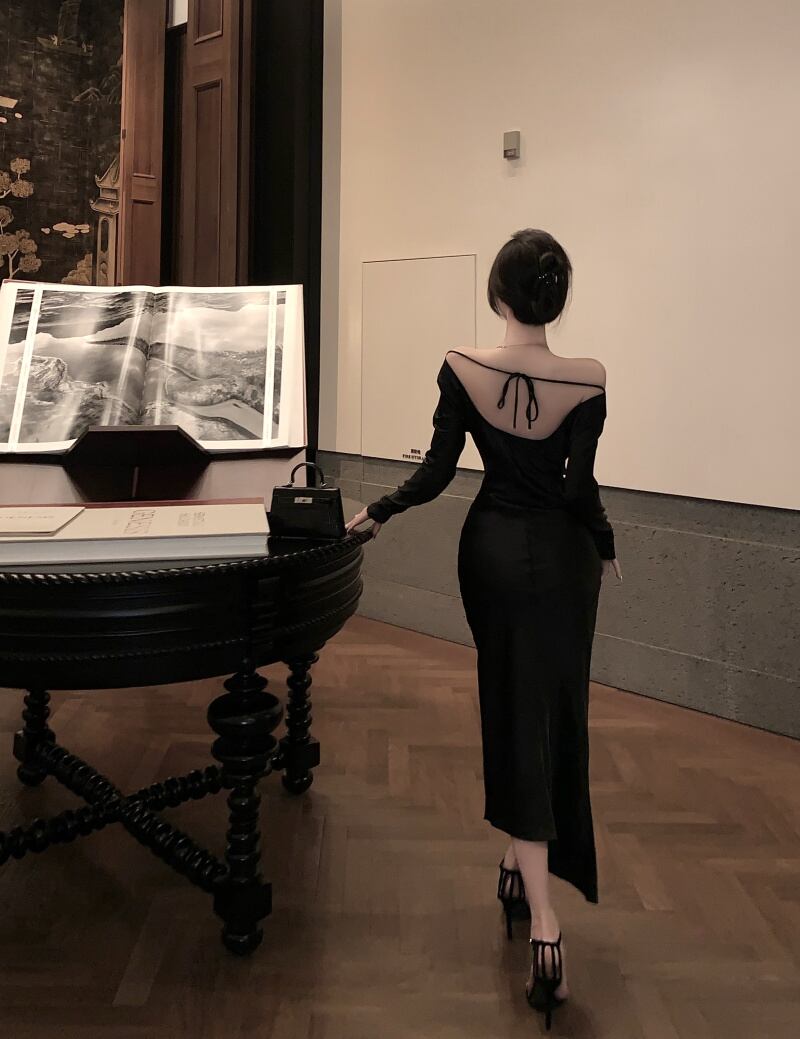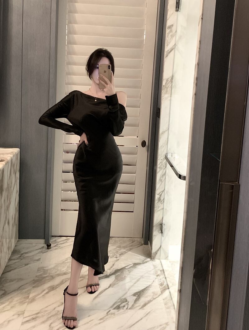 黒のイブニングドレスロングスカート女性の秋と冬のハイエンド気質セクシーな斜めの襟ストラップレスバックレス長袖サテンドレス micat48612029161
