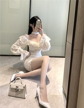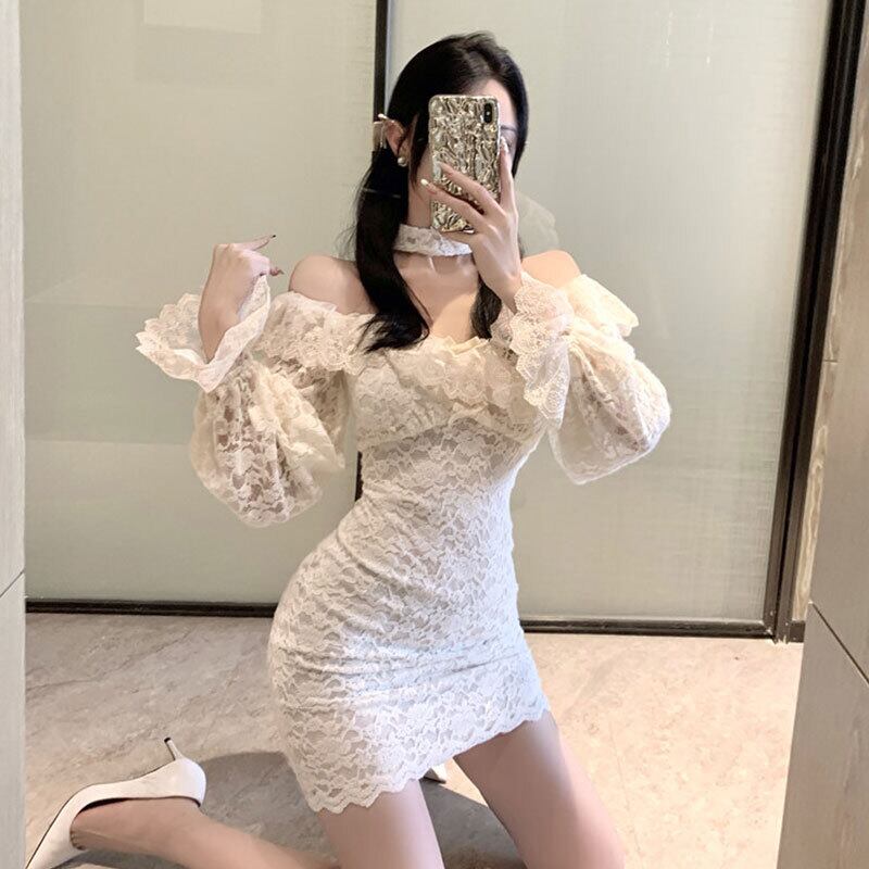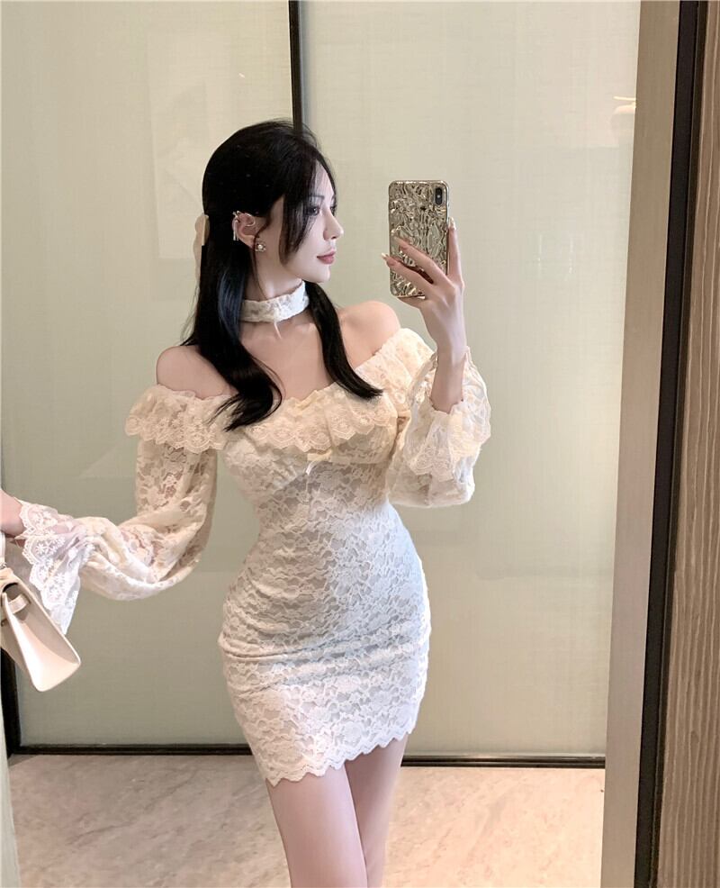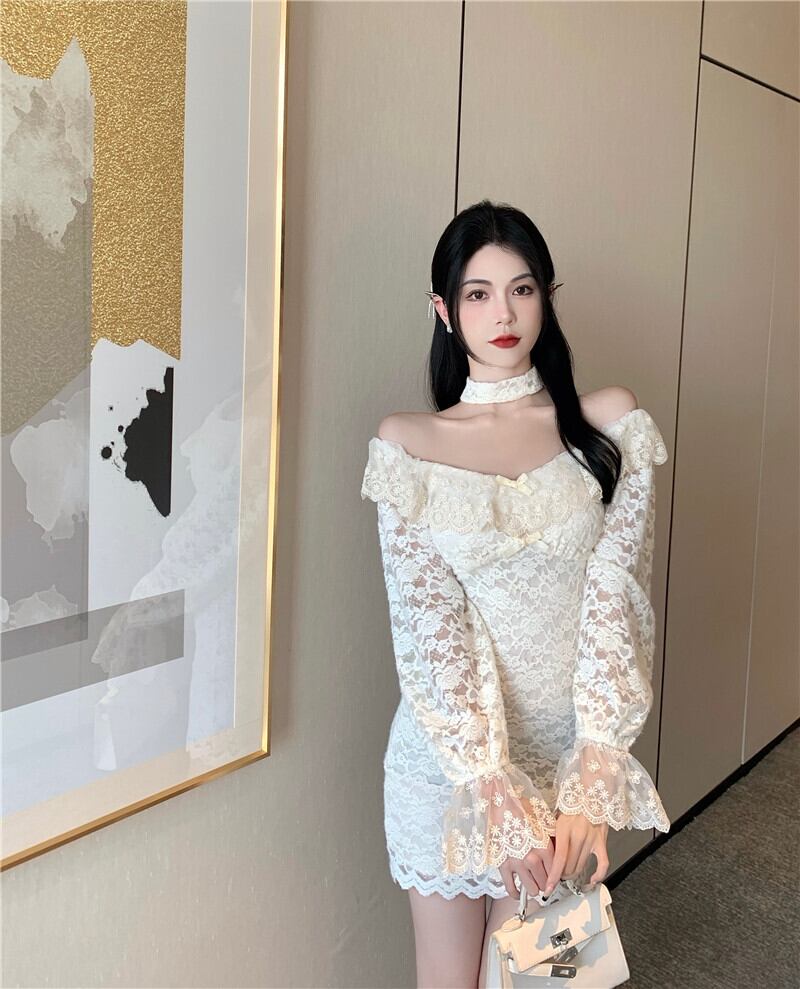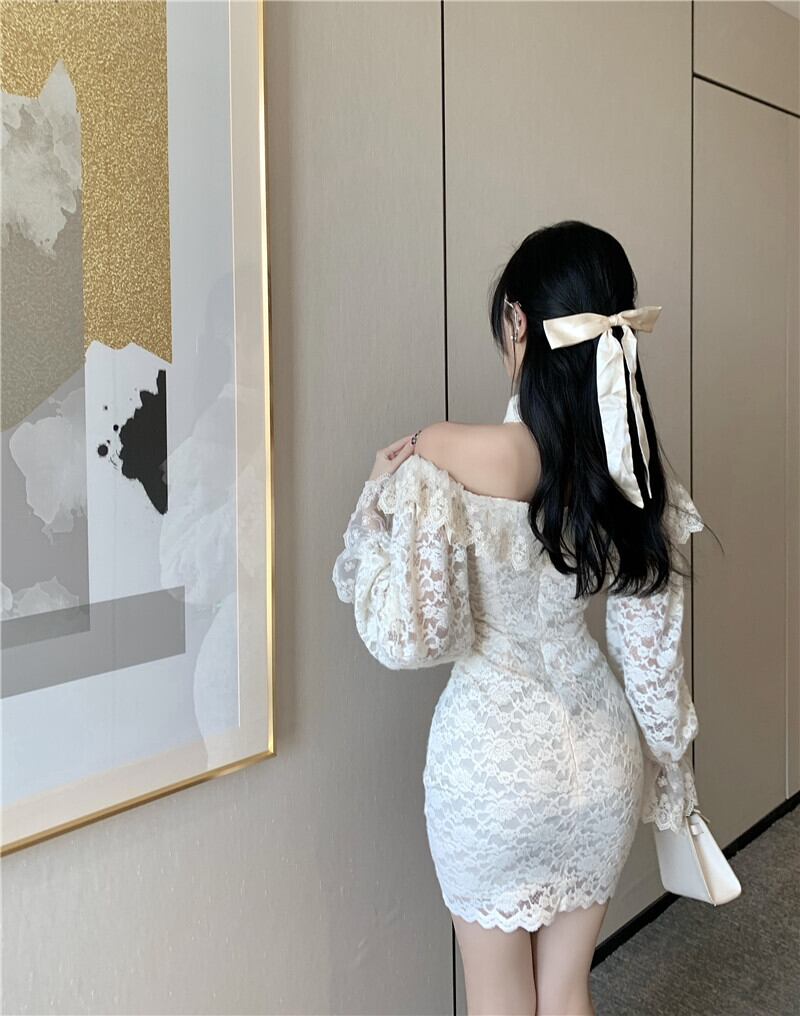 ライブ服女性アンカーポジェニックハイエンドスーパーフェアリーフリルセクシーワンショルダー長袖オフショルダーレースドレス micat42356548067