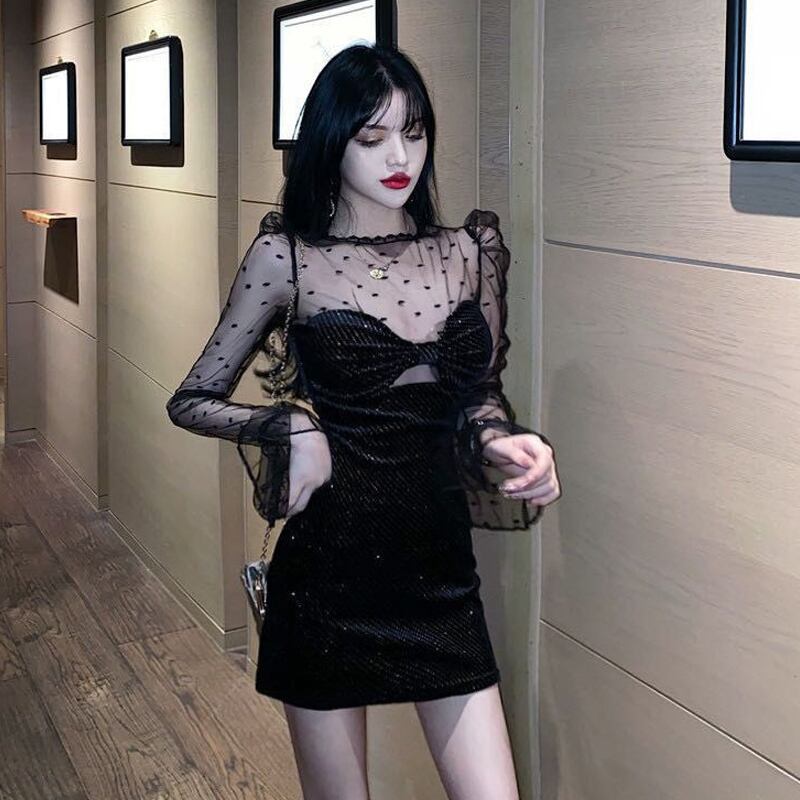 年次総会スモールドレスナイトショップレディースファッションバーバンジーメッシュステッチ長袖タイトフィットヒップドレス micat11412096086