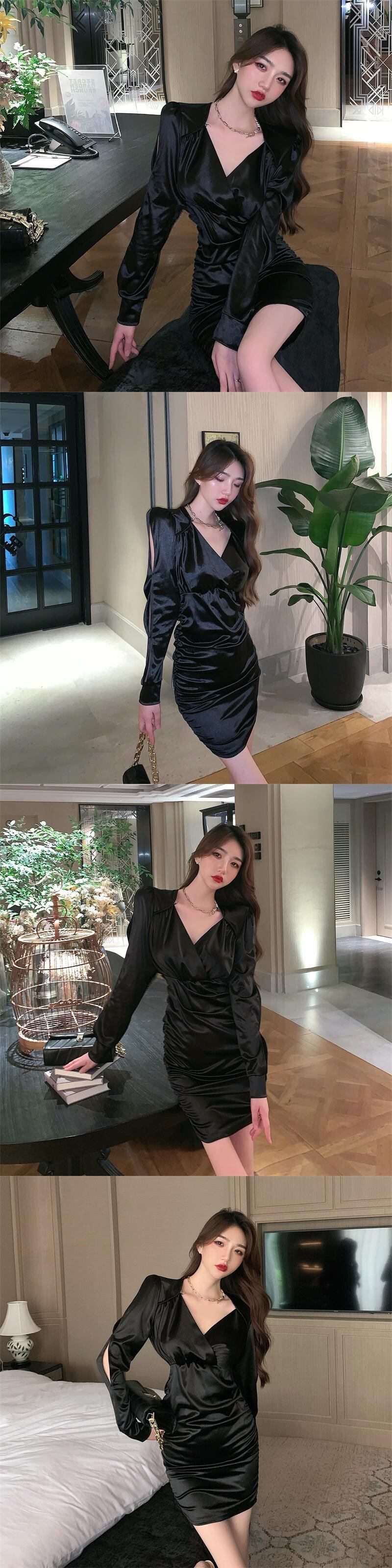 ストリーマーショートスカートナイトクラブレディース秋冬気質セクシーローカットディープVネックサテンと薄手のヒップドレス micat58926622201