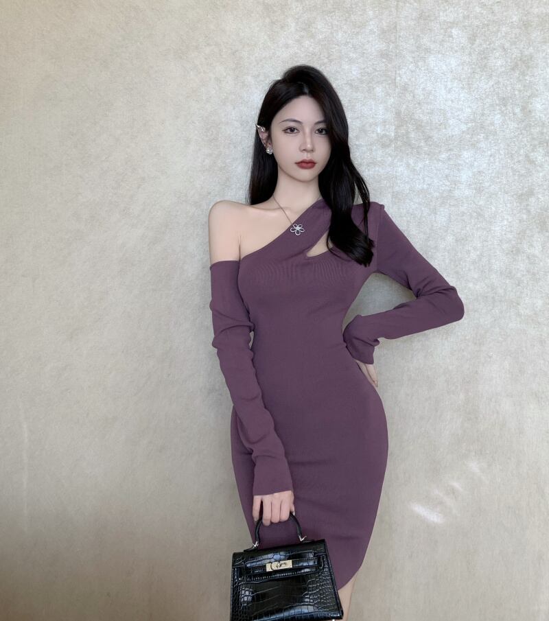 ネットレッドアンカーコスチューム女性秋冬セクシー斜め襟ワンショルダーストラップレスタイトフィットバッグヒップ長袖ネックラインドレス micat39491053338