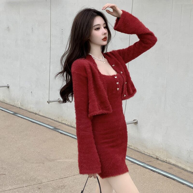 年服婦人用シャツ赤いスーツピュアデザイアふわふわニットカーディガン+セクシーホルタードレス micat40629452489