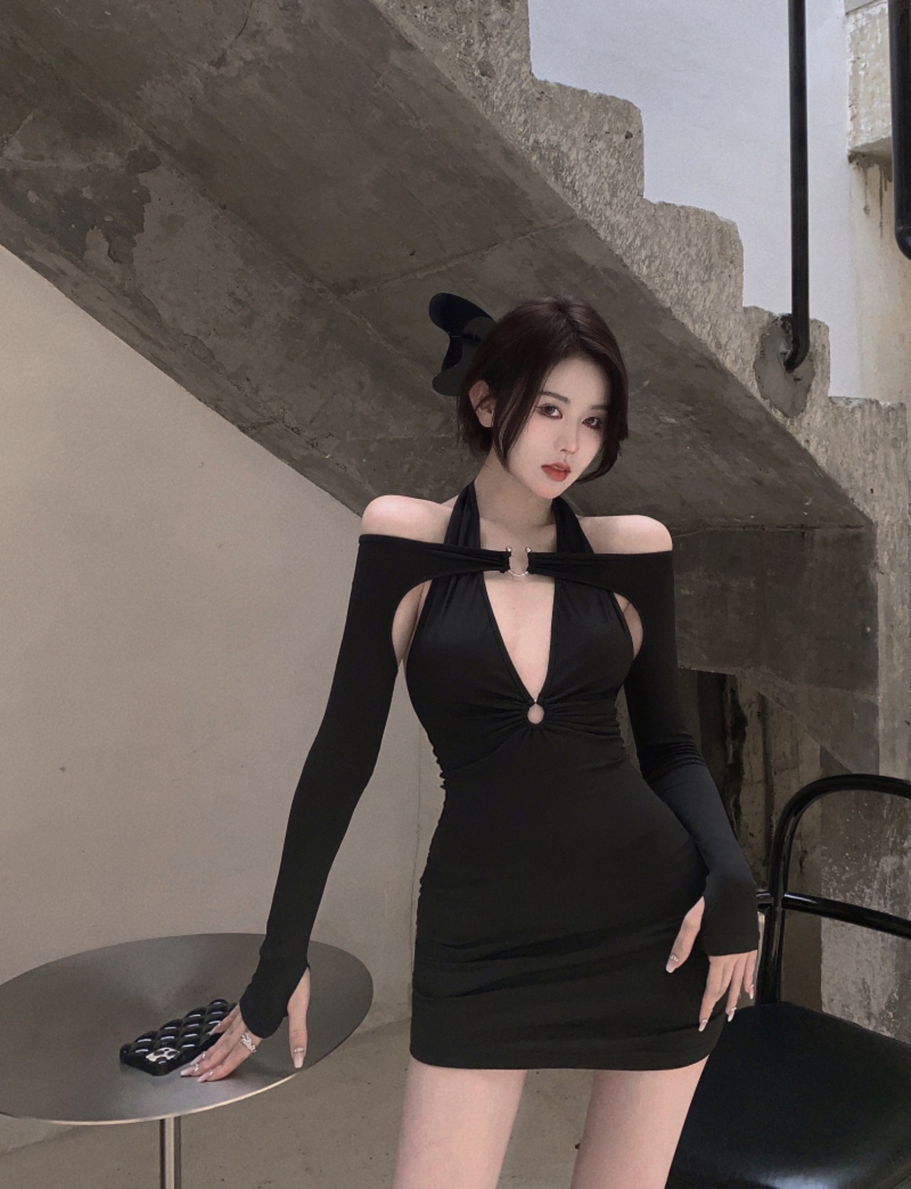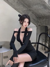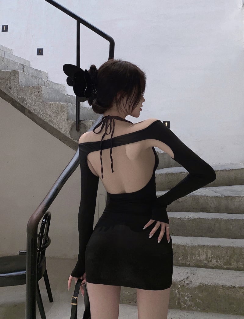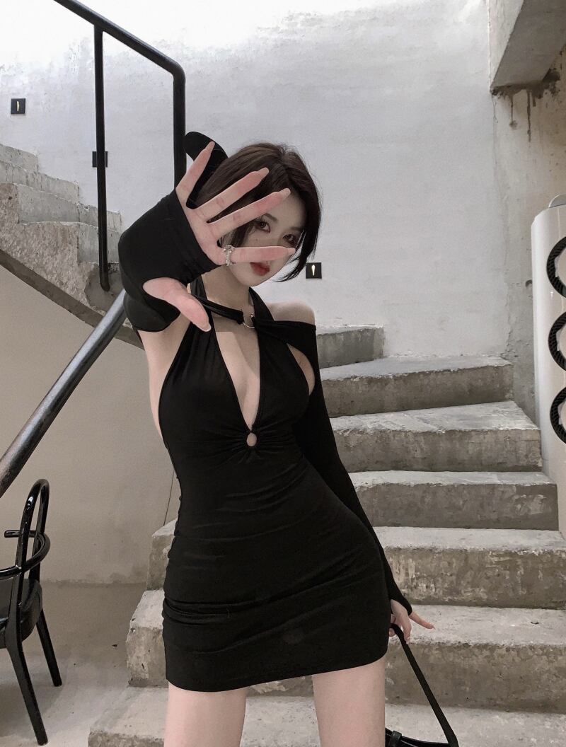 ナイトクラブレディースバーディスコドレススモールブラックドレスショートセクシーローカットディープVネック長袖ヒップドレス micat83543836906