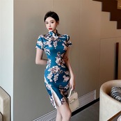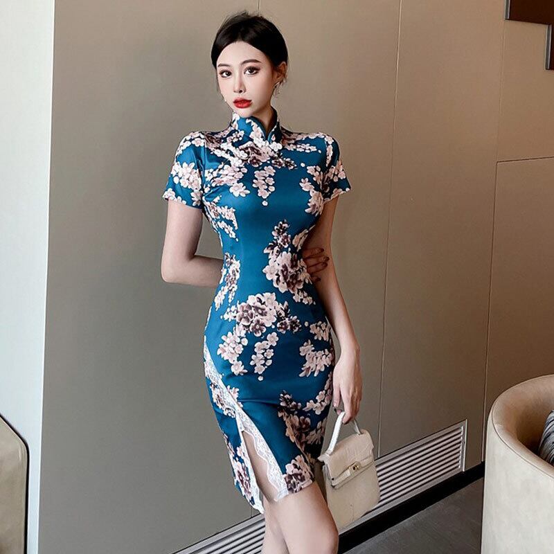 改良されたチャイナドレス若い高級気質中華民国スタイルのレトロな印刷生放送の服女性アンカーセクシーなドレス micat18390313629