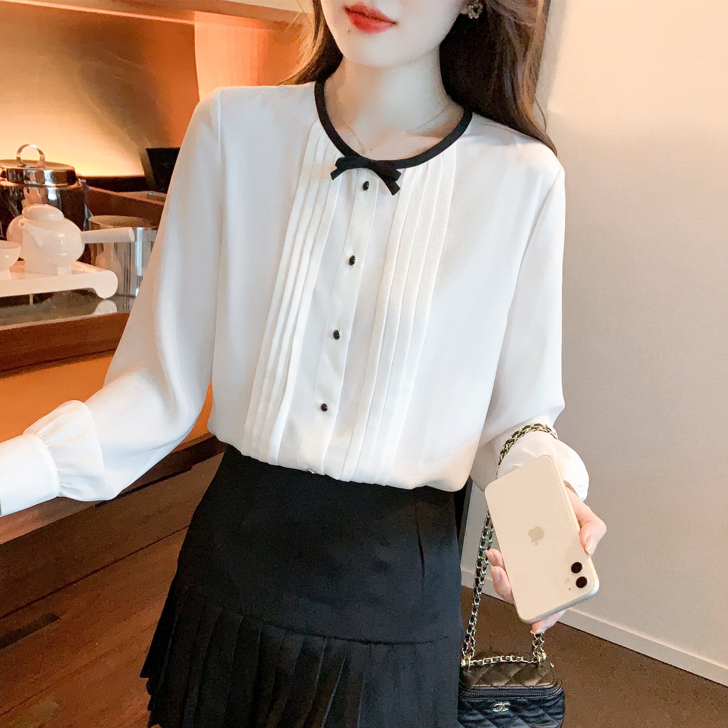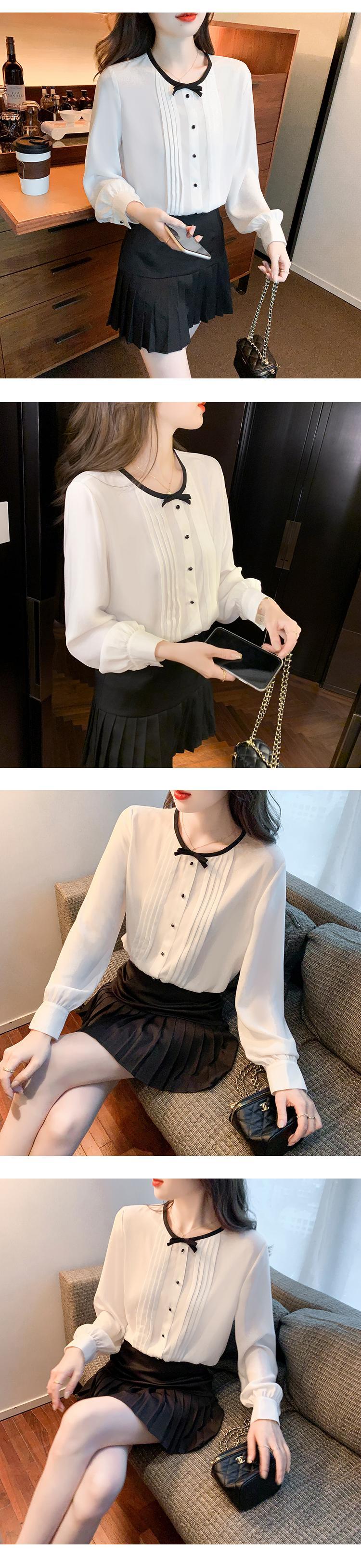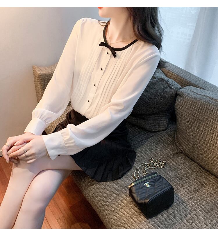 2022年春秋新作ファッションオールマッチレトロラウンドネックボウシャツトップ気質プリーツシフォンシャツ女性 qmn47231908047