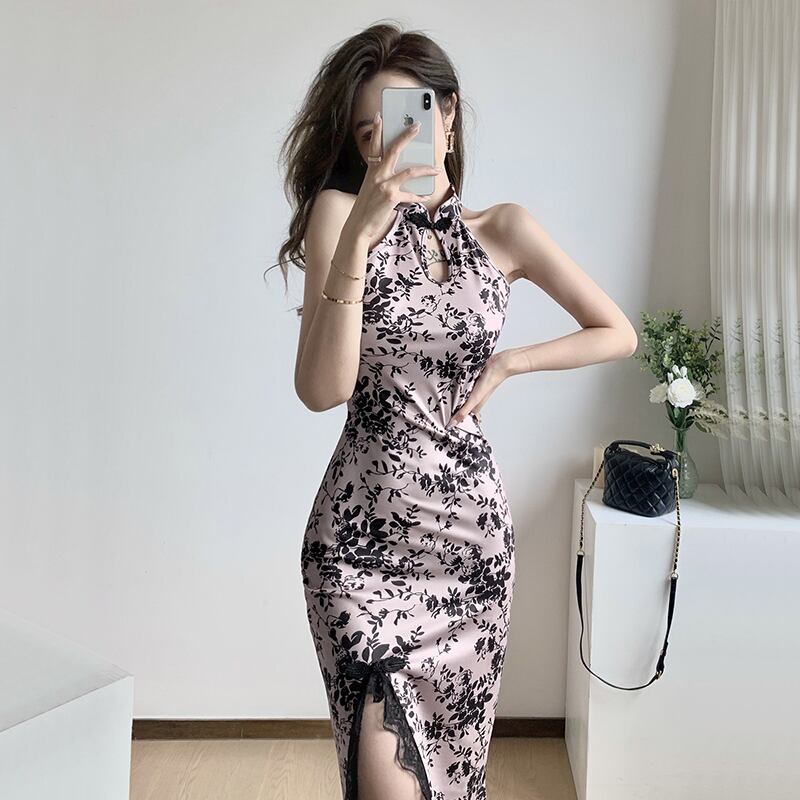 生放送服ポジェニック女性アンカー服若いレトロ花柄セクシーノースリーブ改良チャイナドレス micat18264982494