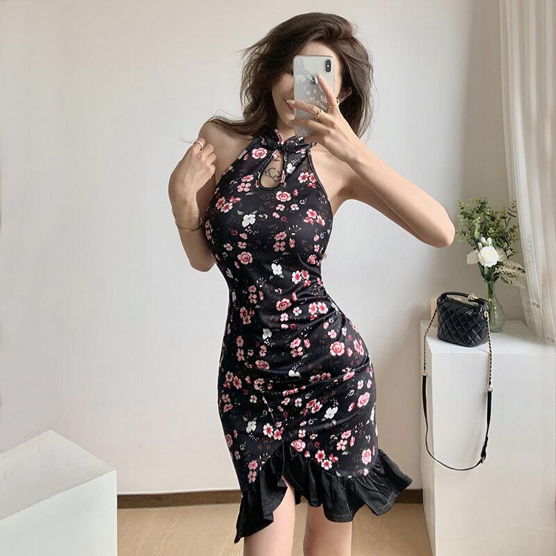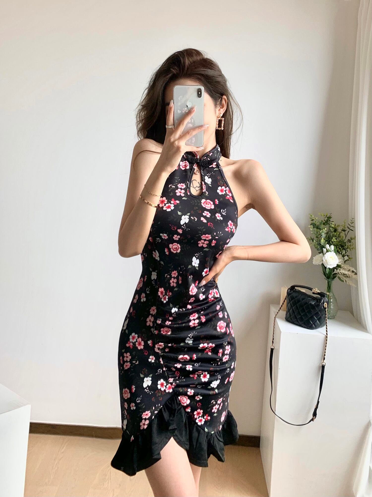 ライブ放送服ポジェニック女性アンカー服若い花のセクシーな背中の開いたホルターネックフィッシュテールチャイナドレスドレス micat31463609576