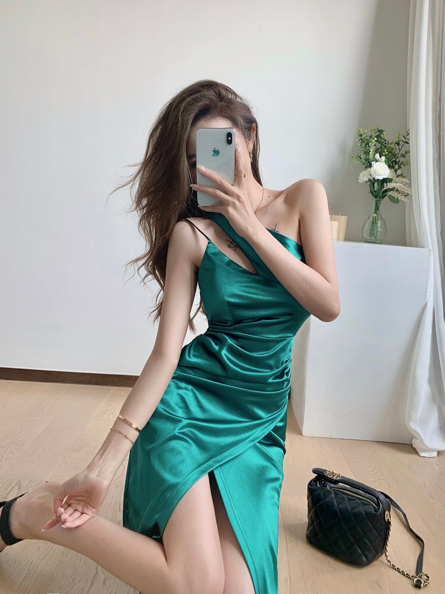 緑のイブニングドレスナイトクラブ女性のナイトクラブ気質セクシーな斜めの襟ワンショルダーオフショルダーミドル丈ドレス micat16386095644