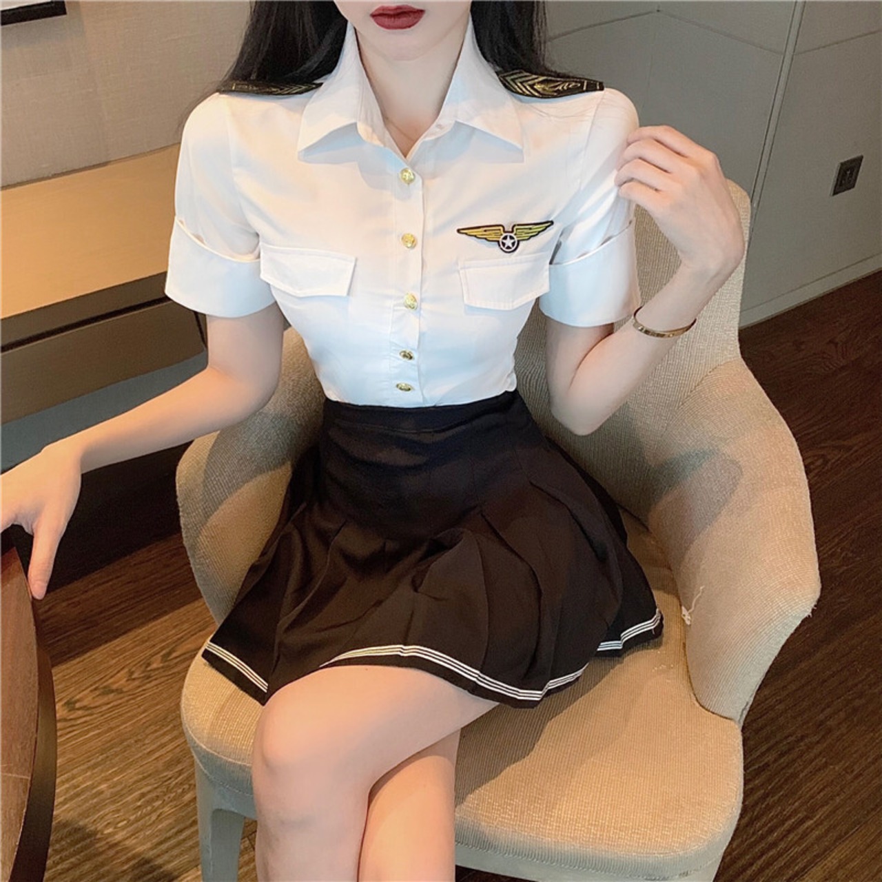 jkスチュワーデスユニムセットサマードレスニューカレッジスタイルホワイトシャツトップ+ハイウエストプリーツショートスカートツーピースセット micat65971657035