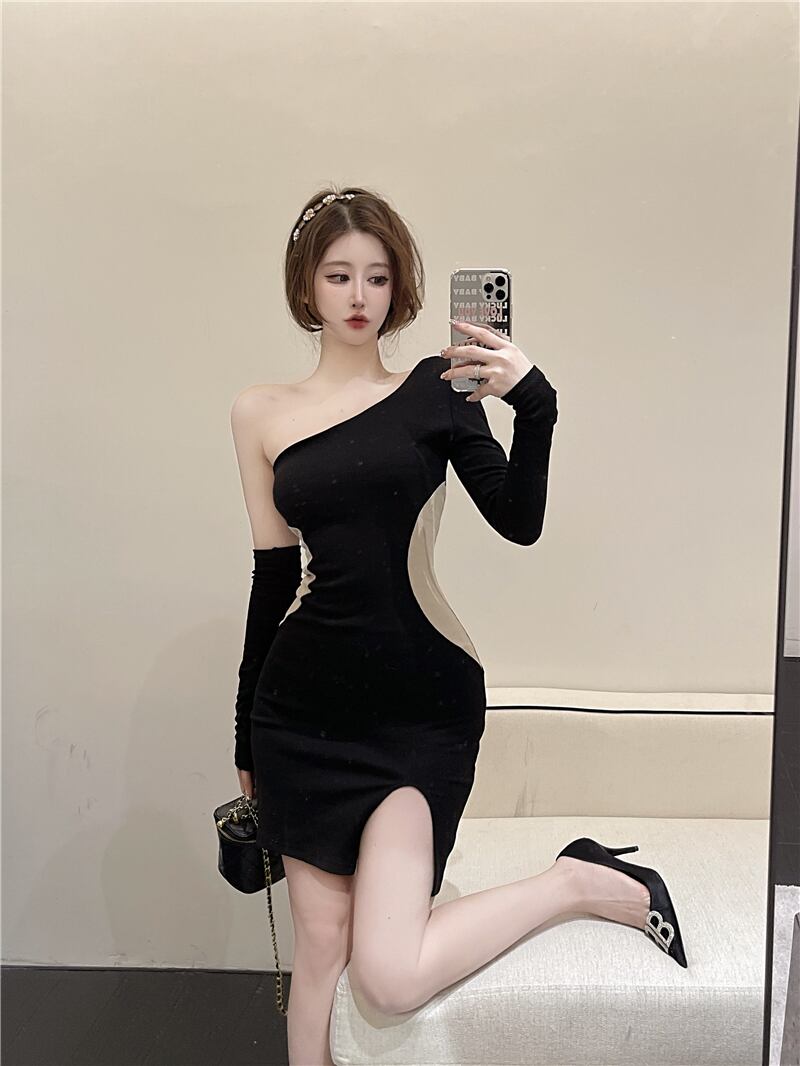 生放送服女性アンカーポジェニックハイエンド気質セクシー斜めネックシングルショルダーストラップレスカラーマッチングボトミングドレス micat77201781008