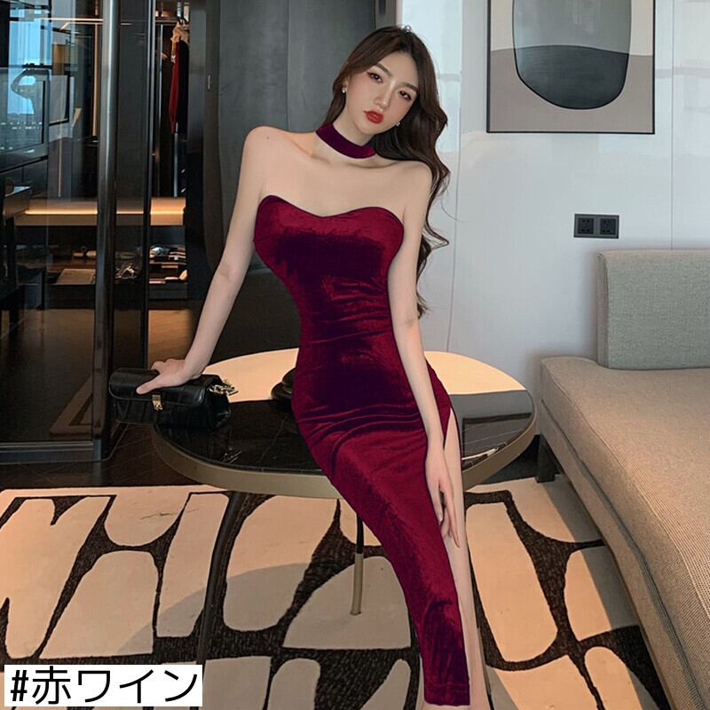 イブニングドレスナイトショップ女性の宴会気質セクシーなVネックゴールドベルベットハイスリットミドル丈チューブトップドレス micat93346173679