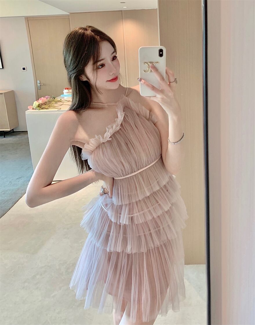年齢を減らすサマードレススーパー妖精気質フランスの非常に妖精セクシーな斜めの肩掛け首レイヤードメッシュケーキスカート micat83681504613