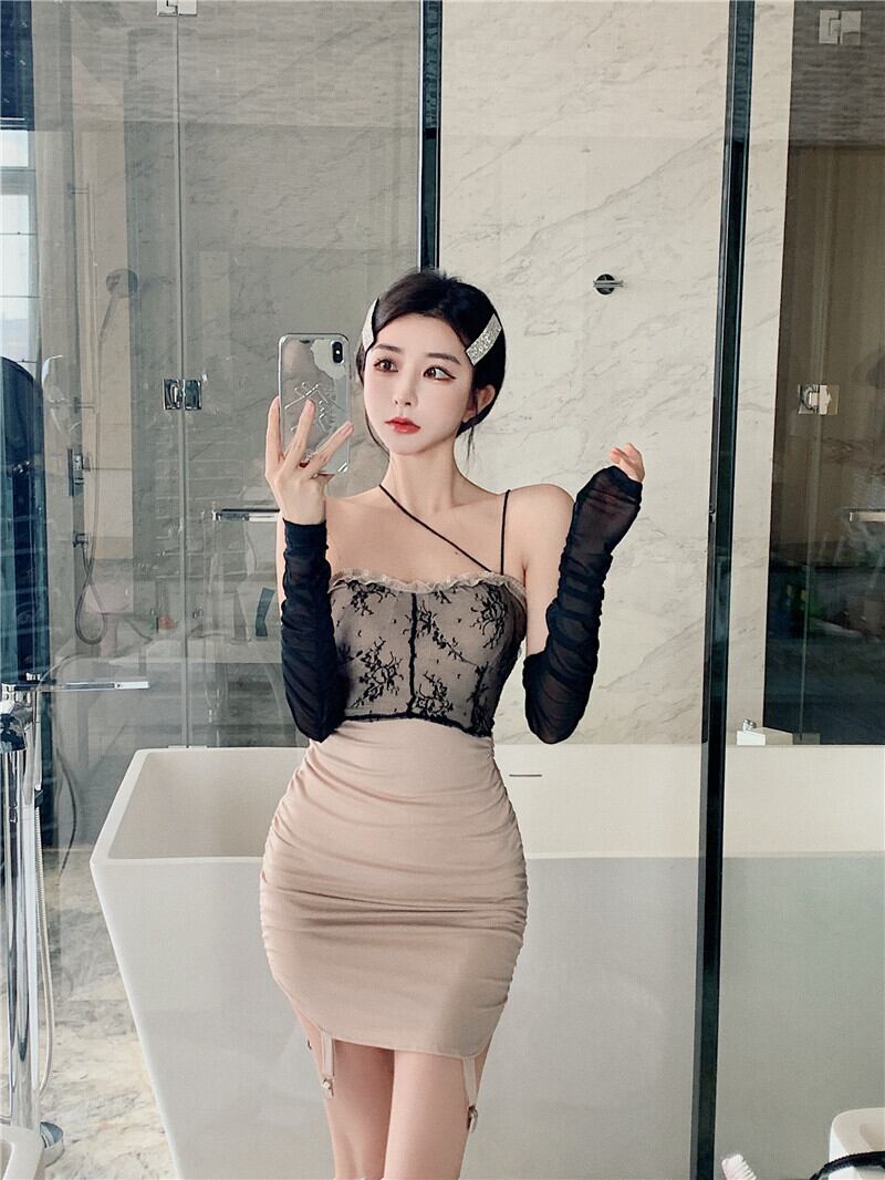 ナイトクラブの女性の夜のシーンネット赤いアンカーレースステッチスリムバッグヒップセクシーな偽のツーピースサスペンダードレス micat6591898375