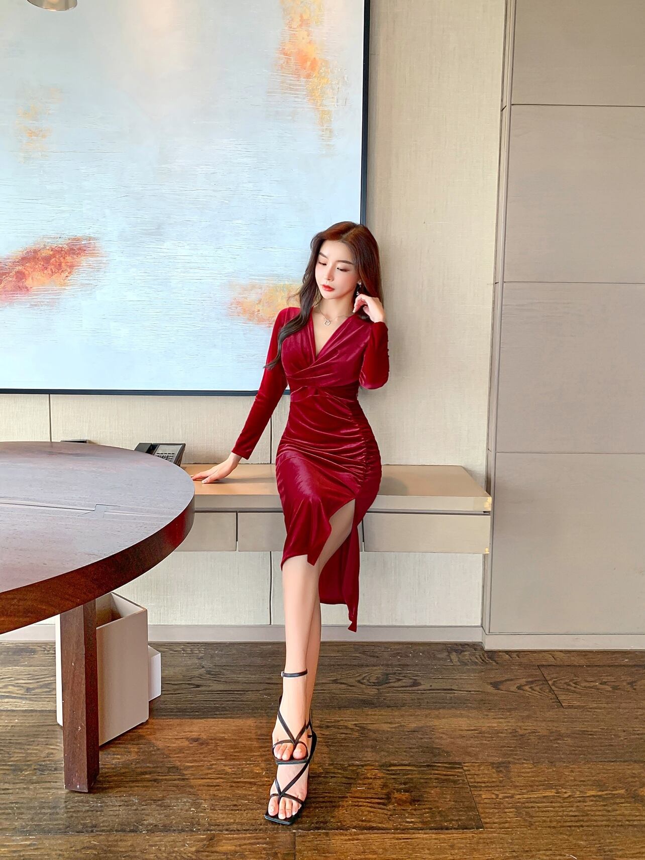 ナイトクラブの女性の秋と冬の夜の作業服はスリムでセクシーな、ローカットで深いVネックのミドル丈のドレスです micat98126781654