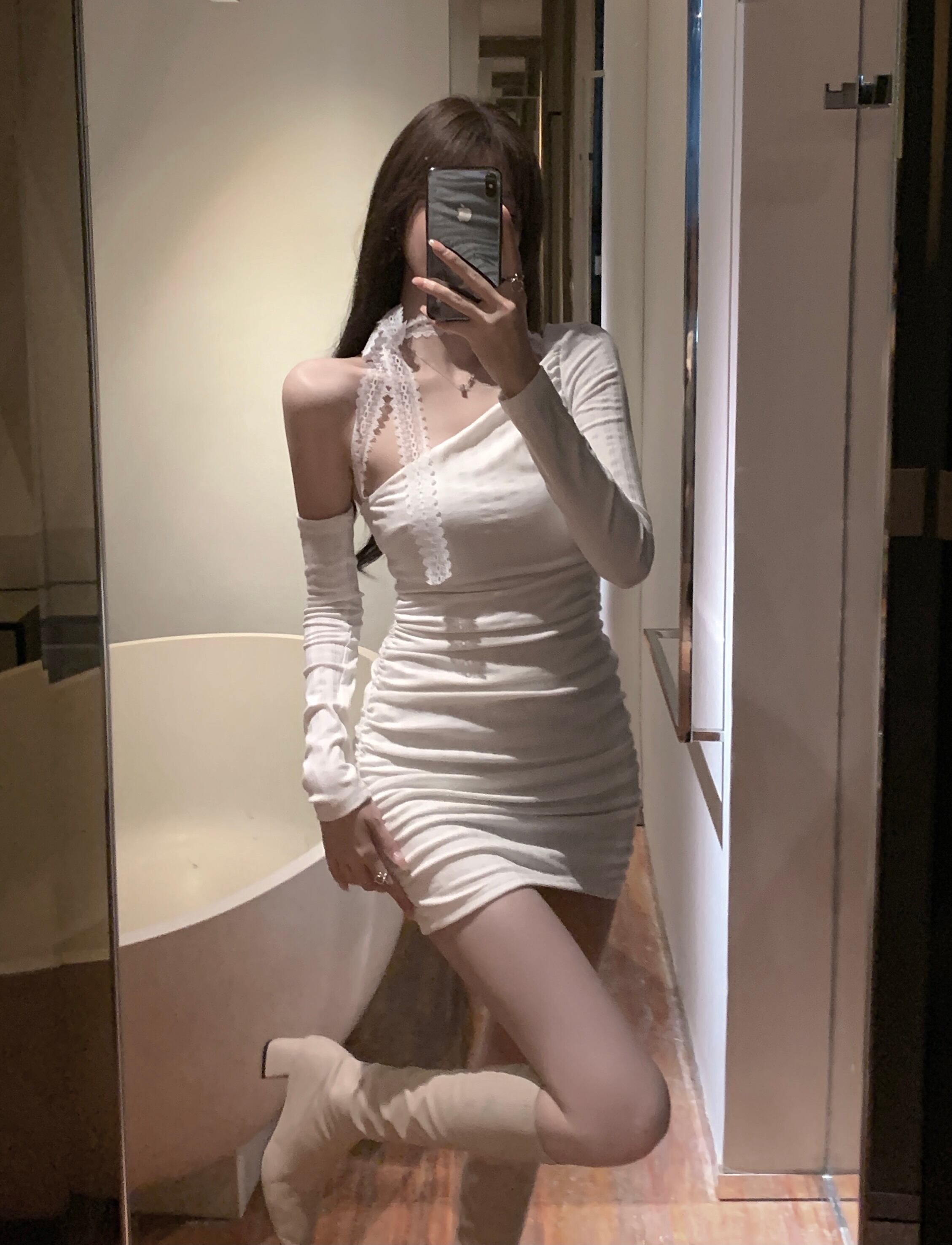 ネット赤いアンカー服女性のデザインセンスニッチ気質セクシーな斜めの襟肩から片方の肩をぶら下げ長袖ネックドレス micat48976284101