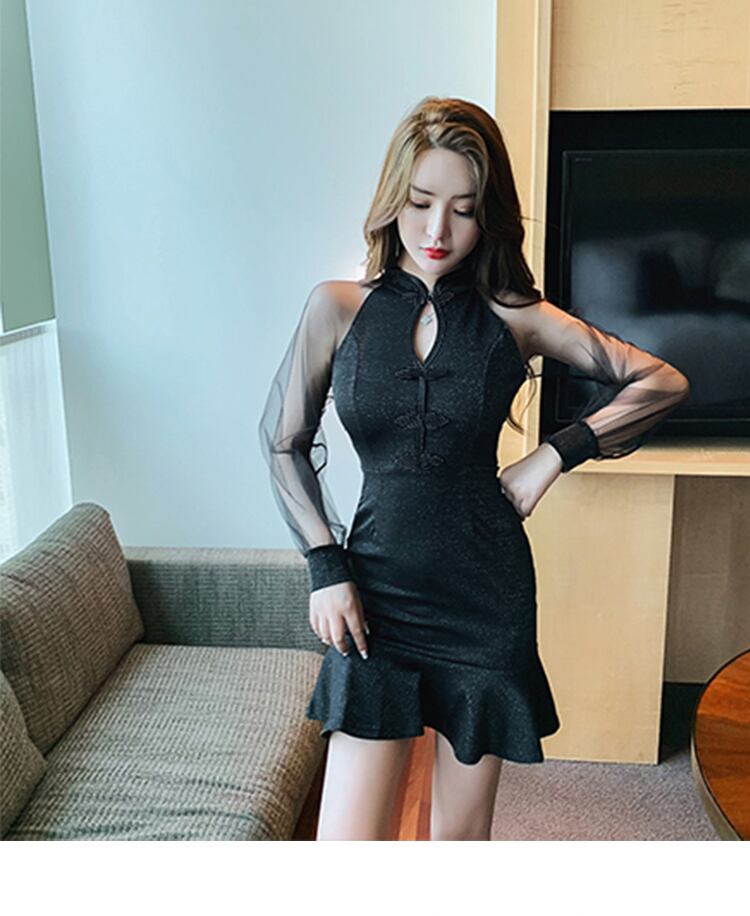 2021年秋新しい女性の若いセクシーなメッシュステッチ光沢のあるシルクフィッシュテールはチャイナドレスを改善しました micat32428622450