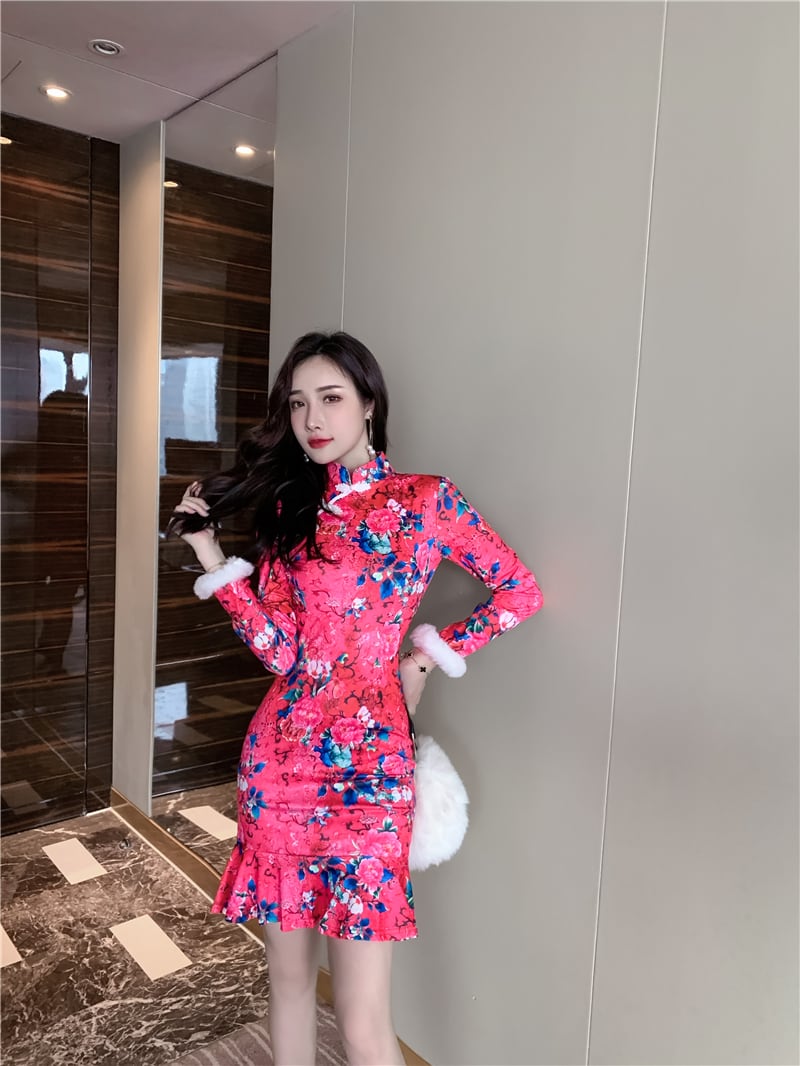 秋と冬のチャイナドレス2021新しい若いレトロな中国風のプリントセクシーなバッグヒップショートフィッシュテールドレス micat99180556058