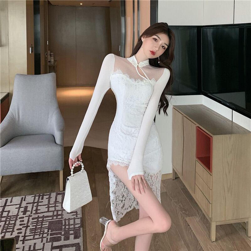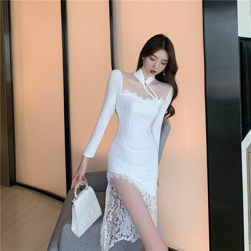 チャイナドレス2021年秋冬気質セクシーメッシュステッチ長袖ハイスリットミドル丈レースワンピース micat83701741313