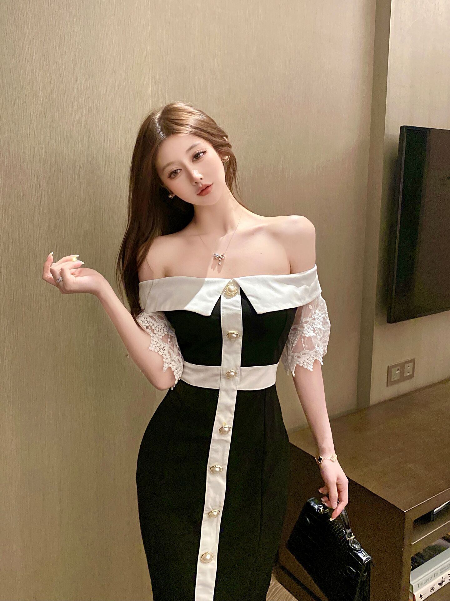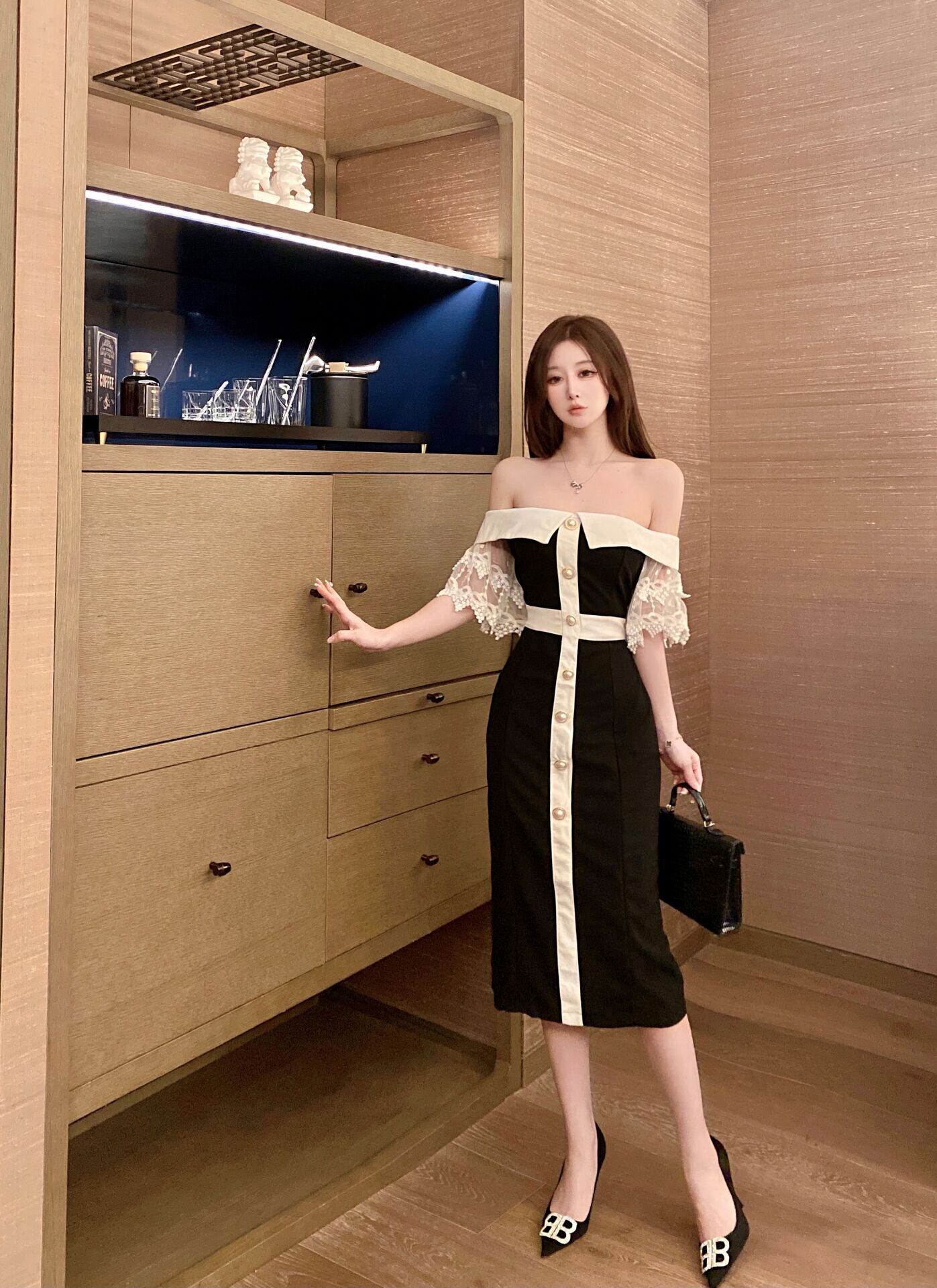 フレンチイブニングドレススカートレディースライトラグジュアリーハイエンド気質セクシーワンショルダー黒と白のステッチミドル丈ドレス micat46946767763